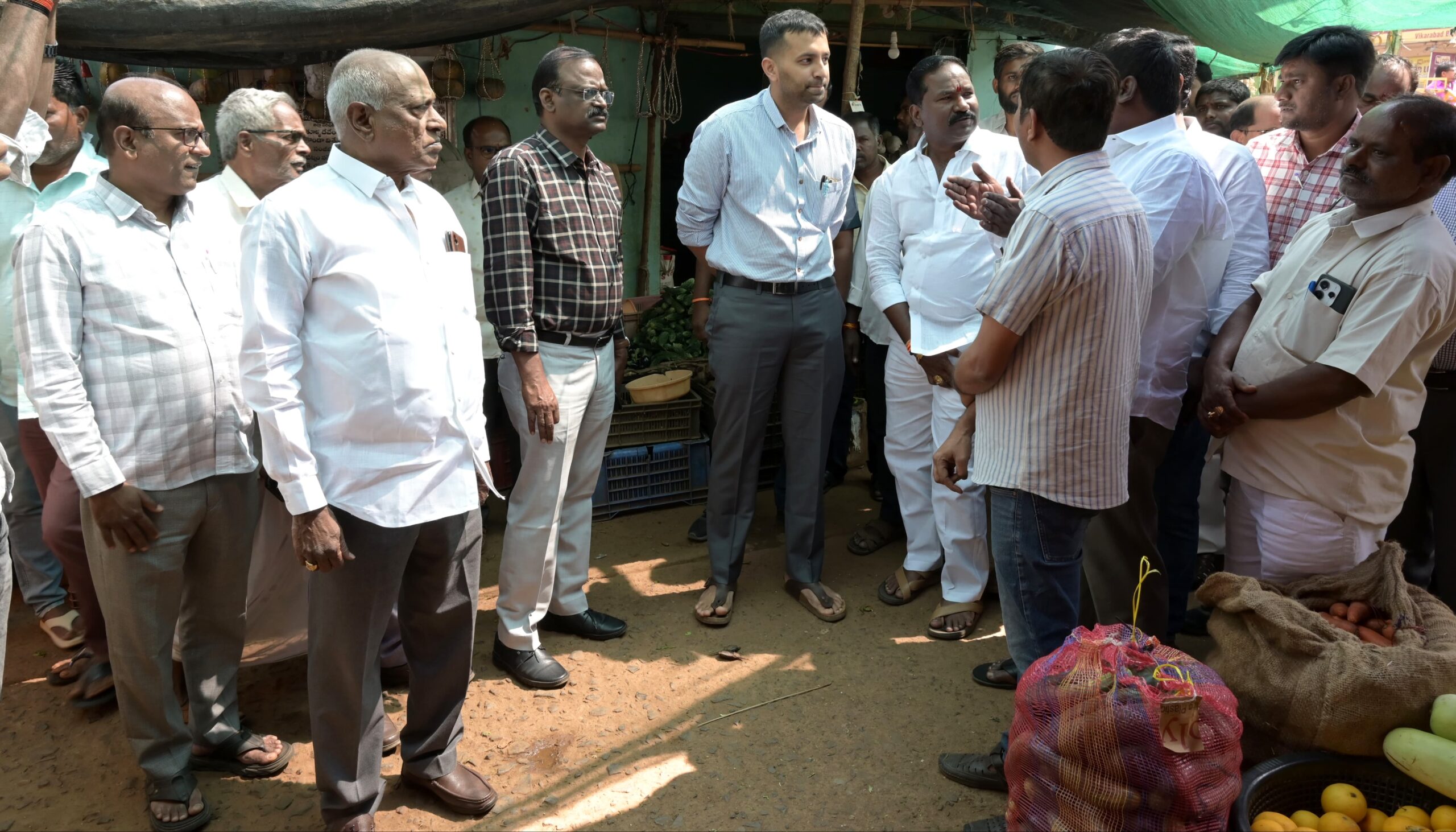 నేటి సాక్షి వికారాబాద్ :వికారాబాద్ పట్టణ కేంద్రంలోని రైతు బజారును ప్రజా ప్రతినిధులు, అధికారులతో కలిసి జిల్లా కలెక్టర్ సందర్శించారు. ఈ సందర్భంగా రైతులు, విక్రయదారులతో రైతు బజారులోని సమస్యలను అడిగి తెలుసుకున్నారు. వేసవి, వర్షాకాలన్ని దృష్టిలో పెట్టుకొని కనీస వసతులు కల్పించాలని జిల్లా కలెక్టర్ అధికారులకు సూచించారు. రైతు బజారులో టాయిలెట్లు, షెడ్ల ఏర్పాటుతోపాటు నీటి సౌకర్యం కల్పించాలని అధికారులకు సూచించారు. వర్షపు నీరు రైతు బజార్ లోకి రాకుండా ఏర్పాట్లు చేయాలని తెలిపారు. కలెక్టర్ తో పాటు అదనపు కలెక్టర్ సుధీర్, మున్సిపల్ చైర్ పర్సన్ గడ్డం అనన్య, వైస్ చైర్మన్. అర్థ సుధాకర్ రెడ్డి, పంచాయతీ రాజ్ ఎగ్జిక్యూటివ్ ఇంజనీర్ ఉమేష్, మార్కెటింగ్ అధికారి సారంగపాణి, మున్సిపల్ కమిషనర్ విక్రమ్ సింహారెడ్డి, మార్కెట్ కమిటీ చైర్మన్ శ్రీనివాస్, మున్సిపల్ కౌన్సిలర్లు, ప్రజా ప్రతినిధులు పాల్గొన్నారు