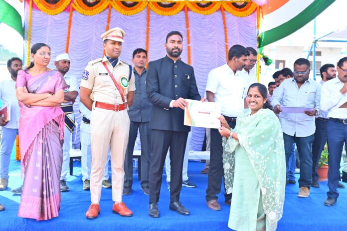 నేటి సాక్షి – జగిత్యాల (పూరెళ్ల బాపు)……………………………………జగిత్యాల జిల్లాలో 77 వ గణతంత్ర దినోత్సవ వేడుకలను ప్రభుత్వ కార్యాలయాలు, పాఠశాలలు, గ్రామ పంచాయతీ కార్యాలయాల్లో జాతీయ జెండాలు ఎగురవేసి ఘనంగా జరుపుకున్నారు. జగిత్యాల జిల్లా కలెక్టరెట్, జిల్లా పరిషత్ కార్యాలయాల్లో కలెక్టర్ సత్యప్రసాద్ జాతీయ జెండా ఎగురావేశారు.పోలీస్ హెడ్ క్వార్టర్ లో ఎస్పీ అశోక్ కుమార్ జాతీయ జెండా ఎగురవేయగా పోలీస్ సిబ్బంది పాల్గొన్నారు.మాజీ మంత్రి తాటిపర్తి జీవన్ రెడ్డి అంబేద్కర్ చౌరస్థలో జెండాను ఎగురావేయగా, ఇందిరా భవన్ లో డీసీసీ అధ్యక్షులు గాజంగి నందయ్య, పాత బస్టాండ్ చౌరస్థలో బీజేపీ నాయకులు సిపెల్లి రవీందర్, ఏసి ఎస్ రాజు, అరవ లక్ష్మి లు,జిల్లా వైద్యాధికారి కార్యాలయంలో డాక్టర్. సుజాత,పోలీస్ స్టేషన్లలోస్లేట్ హైస్కూల్, సూర్యగ్లోబల్ స్కూల్, అకాడమీక్ హైట్స్ పాఠశాల,జగిత్యాల ప్రభుత్వ కొత్తవాడ హైస్కూల్,జగిత్యాల, మెట్పల్లి, కోరుట్ల, రాయికల్, ధర్మపురి మున్సిపల్ వార్డుల్లో జెండా వందనం పండుగ సందర్బంగా జెండాను ఎగురవేసి స్విట్లు పంపిణి చేశారు.గ్రామపంచాయతీల్లో పంచాయతీ కార్యదర్శులు జాతీయ జెండాను ఎగురావేశారు.జగిత్యాల పట్టణంలోని పూరానిపేట గాంధీ విగ్రహం వద్ద అవారి శివకేసరి బాబు జెండా ఎగురవేయగా చెట్ల రవీందర్, కైలాసం, నలుమాస్ గంగాధర్, చెట్ల జానకి, బట్టు సుజాత, జక్కం సరితలు పాల్గొన్నారు.జర్నలిస్ట్ యూనియన్ జిల్లా అధ్యక్షులు చీటీ శ్రీనివాస్ రావు,ఎం డీ ఇమ్రాన్, ప్రెస్ క్లబ్ లో అధ్యక్షులు ఎల్లాల రాజేందర్ రెడ్డి,ఎన్నం కిషన్ రెడ్డి లు జెండా ఎగురావేశారు.కలెక్టరెట్, ప్రభుత్వ, ప్రయివేట్ పాఠశాలల్లో చిన్నారులు చేసిన సంస్కృతిక కార్యక్రమాలు అహుతులను అలరించాయి.