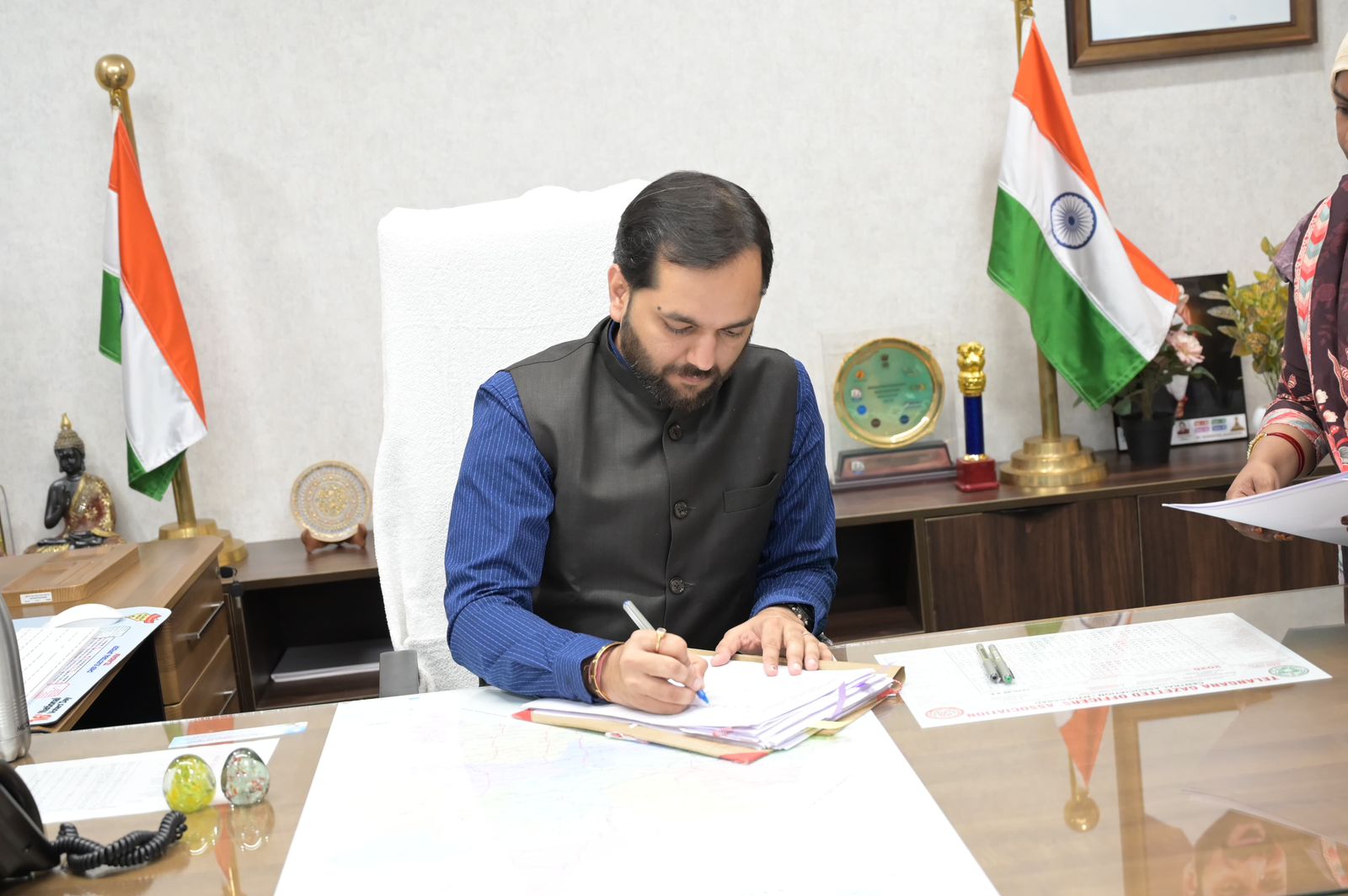 నేటి సాక్షి వికారాబాద్ :వికారాబాద్ జిల్లా నూతన జిల్లా కలెక్టర్గా దీపక్ తివారి, శనివారం సాయంత్రం 6.00 గంటలకు ఐడీఓసి కార్యాలయంలోని తన ఛాంబర్లో తొలి సంతకం చేసి అధికారికంగా పదవీ బాధ్యతలను స్వీకరించారు. ఈ సందర్భంగా అదనపు కలెక్టర్ (రెవెన్యూ) రాజేశ్వరి, ఎసి ఎల్ బి సుధీర్, ట్రైని కలెక్టర్ హార్స్ చౌదరి,నూతన కలెక్టర్ను కలిసి పుష్పగుచ్ఛా లు అందించి శుభాకాంక్షలు తెలిపారు. జిల్లాలోని అన్ని శాఖల జిల్లా అధికారులు, సిబ్బంది హాజరై నూతన కలెక్టర్కు అభినందనలు తెలియజేశారు.అనంతరం కలెక్టర్ ఛాంబర్లో జిల్లా అధికారుల పరిచయ కార్యక్రమం నిర్వహించబడింది.జిల్లా కలెక్టర్ దీపక్ తివారి , ఐఏఎస్ మాట్లాడుతూ వికారాబాద్ జిల్లాలో జిల్లా కలెక్టర్గా పని చేసే అవకాశం లభించడం తనకు గౌరవంగా సంతోషంగా ఉందన్నారు. ప్రభుత్వ ప్రాధాన్యతలు, లక్ష్యాల మేరకు అన్ని శాఖల అధికారులతో సమన్వయం చేసుకుంటూ పారదర్శకత, విద్యా, వైద్యం ప్రధాన లక్ష్యాలుగా పెట్టుకుని సమర్థవంతమైన పరిపాలన అందించేందుకు కృషి చేస్తానని తెలిపారు. ప్రజల సమస్యల పరిష్కారానికి ప్రాధాన్యత ఇస్తూ వేగవంతమైన సేవలందించేందుకు ప్రత్యేక దృష్టి సారిస్తానని అన్నారు .జిల్లా అభివృద్ధి, సంక్షేమ పథకాల సమర్థవంతమైన అమలు, ప్రజలతో సత్సంబంధాలు నెలకొల్పడం వంటి అంశాల్లో సమగ్రంగా ముందుకు సాగాలని అన్ని శాఖల అధికారులకు సూచించారు.శాఖ ల వారీగా, మండలం వారీగా రివ్యూ చేస్తానని, మీరు చేపట్టే పనులు అభివృద్ధి ఫోటోలు పూర్తి వివరాల తో నోట్ సమర్పించాలని అధికారులకు సూచించారు.ఈ కార్యక్రమం లో డి ఆర్ ఓ మంగీ లాల్, ఆర్ డి ఓ వాసు చంద్ర, కాడ అభివృద్ధి అధికారి వెంకట్ రెడ్డి, డి ఆర్ డి ఎ శ్రీనివాస్, జిల్లా అధికారులు తదితరులు పాల్గొన్నారు.