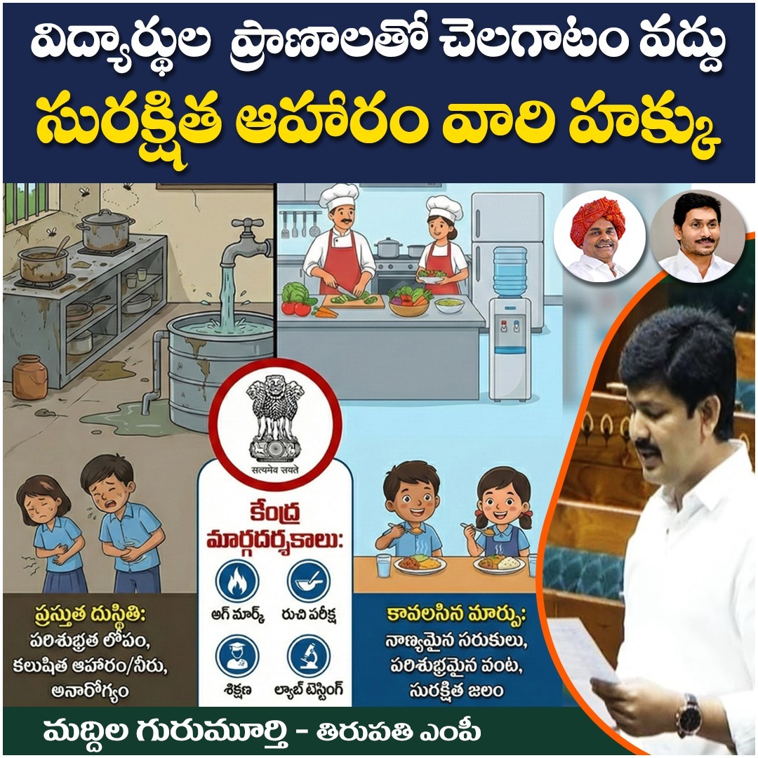 నేటి సాక్షి తిరుపతి (బాదూరు బాల)ఆంధ్రప్రదేశ్‌లో ప్రభుత్వ పాఠశాలలు, హాస్టళ్లలో తరచూ చోటుచేసుకుంటున్న ఫుడ్ పాయిజనింగ్ ఘటనలపై ఆందోళన వ్యక్తం చేస్తూ తిరుపతి ఎంపీ డా.మద్దిల గురుమూర్తి లోక్‌సభలో కీలక ప్రశ్న వేశారు. గత ఏడాది కాలంలో తిరుపతి పార్లమెంటు పరిదిలోని నాయుడుపేట, సత్యవేడు, శ్రీకాళహస్తి తోపాటుగా రాష్ట్రంలో జరిగిన పలు సంఘటనలు తనను తీవ్రంగా కలచివేశాయని ఎంపీ గురుమూర్తి పేర్కొన్నారు.పరిశుభ్రత లోపం, పాడైన ఆర్ఓ ప్లాంట్లు, శుభ్రం చేయని నీటి ట్యాంకులు, వంటగది పరిశుభ్రత లోపం వంటి కారణాల వల్ల విద్యార్థులు అనారోగ్యానికి గురవుతున్న నేపథ్యంలో ఎంపీ ఈ సమస్యపై కేంద్ర ప్రభుత్వం తీసుకుంటున్న చర్యలు, రాష్ట్ర ప్రభుత్వాలతో సమన్వయం వంటి వివరాలు కోరారు.ఈ ప్రశ్నకు కేంద్ర విద్యాశాఖ సహాయ మంత్రి జయంత్ చౌదరి సమాధానం ఇస్తూ ఆంధ్రప్రదేశ్ ప్రభుత్వం అందించిన సమాచారం గురించి ప్రస్తావిస్తూ, ఇటీవల కొన్ని పాఠశాలలలో నీరు, ఆహారం కలుషితం కావడం వల్ల విద్యార్థులు అస్వస్థతకు గురైనట్లు మంత్రి స్పష్టం చేశారు. అయితే, వారందరికీ వైద్య చికిత్స అందించి డిశ్చార్జ్ చేసినట్లు తెలిపారు. ఈ ఘటనల అనంతరం రాష్ట్ర ప్రభుత్వం అన్ని ప్రభుత్వ హాస్టళ్లలో తనిఖీలు నిర్వహించి, లోపాలు ఉన్న చోట వెంటనే సరిదిద్దినట్లు తెలిపారు.ఈ సమాధానంపై తిరుపతి ఎంపీ గురుమూర్తి స్పందిస్తూ ఇచ్చిన సమాధానానికి భిన్నమైన పరిస్థితులు రాష్ట్రంలో నెలకొని ఉన్నాయని ఆవేదన వ్యక్తం చేశారు. ఇలాంటి ఘటనలు జరగక ముందే చర్యలు తీసుకొంటే సమస్య ఉండేది కాదన్నారు. ఇప్పటికీ చాలా వసతి గృహాలలో కనీస వసతుల కల్పనలో రాష్ట్ర ప్రభుత్వం విఫలమైందని పేర్కొన్నారు. తప్పులు సరిదిద్దక పోగా ఇలా కేంద్ర ప్రభుత్వాన్ని తప్పుదారి పట్టించేలా నివేదికలు పంపుతున్నారని ఎంపీ ఆగ్రహం వ్యక్తం చేశారు.దేశవ్యాప్తంగా అమలులో ఉన్న ప్రధాన మంత్రి పోషణ శక్తి నిర్మాణ పథకం వివరాల తోపాటుగా పాఠశాలల్లో భోజన నాణ్యత, భద్రత కోసం కేంద్ర ప్రభుత్వం జారీ చేసిన మార్గదర్శకాల గురించి మంత్రి వివరిస్తూ, ఈ పథకాన్ని అమలు చేయడం, ప్రతిరోజూ విద్యార్థులకు పోషకాహారంతో కూడిన వేడి భోజనం అందించడం పూర్తిగా రాష్ట్ర ప్రభుత్వాల బాధ్యత అని స్పష్టం చేశారు. కేంద్ర ప్రభుత్వం ఇప్పటికే పాఠశాలలు, వసతిగృహాలలో ఖచ్చితంగా పాటించాల్సిన పలు నియమాలు, సూచనలు జారీ చేసినట్లు మంత్రి తెలిపారు. అగ్‌మార్క్ నాణ్యత గల సరుకులు కొనుగోలు చేయడం, వంట కార్మికులకు శిక్షణ ఇవ్వడం, వండిన ఆహారం పిల్లలకు అందించే ముందు ఉపాధ్యాయులు, పాఠశాల యాజమాన్య కమిటీ సభ్యులతో రుచి చూసే విధానం, అలాగే ఆహార నమూనాలను గుర్తింపు పొందిన ప్రయోగశాలలలో పరీక్షించడం వంటి చర్యలు అందులో భాగమని వివరించారు. 