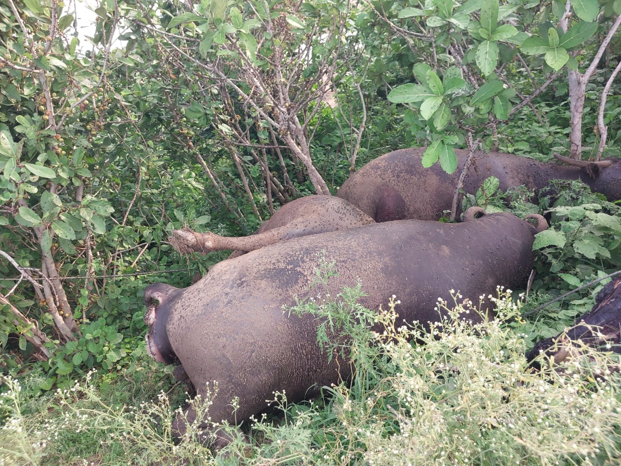 నేటిసాక్షి, రాయికల్ : రాయికల్ మండలం ఇటిక్యాల గ్రామ శివారులో మేత కోసం వెళ్లిన మూడు పాడిగేదెలు విద్యుత్ షాక్తో మృతి చెందిన సంఘటన మంగళవారం చోటు చేసుకుంది. గ్రామానికి చెందిన దండవేని అంతయ్య, మారాసు గంగారాం, గడికొప్పుల మల్లేశంలకు చెందిన గేదెలు మేత కోసం గ్రామ శివారులోకి వెళ్లాయి. అయితే తెగిపడిన విద్యుత్ తీగలతో విద్యుత్ సరఫరా జరిగి ప్రమాదవశాత్తు వాటికి తగలడంతో అవి అక్కడికక్కడే మృతి చెందాయి. బాధితు రైతులను ప్రభుత్వం ఆదుకోవాలని గ్రామస్తులు కోరుతున్నారు.ఫోటో రైటప్: 17RKL01: మృతి చెందిన పాడిగేదెలు