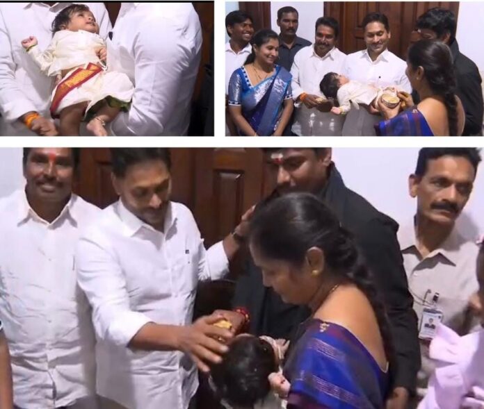 నేటి సాక్షి, అన్నమయ్య జిల్లా, శర్మ, డిసెంబర్ 17 ~అన్నమయ్య జిల్లా :-: తాడేపల్లి లోని వైయస్ఆర్సీపీ కేంద్ర కార్యాలయంలో ఓ అరుదైన సంఘటన చోటు చేసుకుంది. పల్నాడు జిల్లా వినుకొండ నియోజకవర్గ పరిధిలోని బొల్లాపల్లి జడ్పీటీసీ రమావతు భీమి బాయి, బంజారా సేవాలాల్ సేన రాష్ట్ర అధ్యక్షుడు కృష్ణా నాయక్ ఆయన కుమారుడు అనిల్ కుమార్ నాయక్, కోడలు విజయలక్ష్మి లు కేంద్ర కార్యాలయంలో వైయస్ జగన్ ను మర్యాదపూర్వకంగా కలిశారు. ఈ సందర్భంగా జడ్పీటీసీ రమావతు భీమి బాయి, బంజారా సేవాలాల్ సేన రాష్ట్ర అధ్యక్షుడు కృష్ణా నాయక్ కోరిక మేరకు ఆయన మనువడి కి వైయస్ జగన్ చేతుల మీదగా అన్నప్రాసన కార్యక్రమం తో పాటు నామకరణం చేయించాలని ఎప్పటినుంచో భావిస్తున్నారు. వాళ్ళ కళ ఎట్టకేలకు బుధవారం నాడు సాకారమైంది. బుధవారం జడ్పీటీసీ కుటుంబ సభ్యులు ఏకమై వైయస్ఆర్సీపీ కేంద్ర కార్యాలయం వద్దకు చేరుకున్నారు. అక్కడ నుండి నేరుగా వైయస్ జగన్ కార్యాలయం వద్దకు వెళ్లి జగన్ కు వివరించారు. జడ్పీటీసీ గా చెప్పారు. అంతలోనే బుడ్డోడిని చూసిన వైయస్ జగన్ వారి వద్ద నుంచి బుడ్డోడిని అందుకున్నారు. ఆ పిల్లాడు జగన్ ఎత్తుకున్నంతసేపు ఆయన వైపే చూస్తూ ముసి ముసి నవ్వులతో హుషారుగా గెంతు లేసాడు. అనంతరం కుటుంబ సభ్యులకు కోరిక మేరకు అన్నప్రాసన మరియు నామకరణం చేయాలని కోరారు. చంటి బుడ్డోడిని లాలించి వారిని అడిగి విచారించి ప్రజ్వల్ కృష్ణ రాథోడ్ గా నామకరణం చేసి చంటి పిల్లాడికి ఆశీస్సులు అందించాడు. ఈ మేరకు చంటి పిల్లాడు తాత, నానమ్మ హర్షం వ్యక్తం చేస్తూ తమ మనవడికి వైయస్ జగన్ చేతుల మీదుగా అన్నప్రాసన, నామకరణం జరిగినందుకు ఎంతో సంతోషిస్తున్నామని ఆయన చేతుల మీదగా కార్యక్రమాలను చేయించాలనుకున్నామని ఇంత దూరం నుంచి వచ్చినందుకు మా కళ సాకారమైంది. జగన్ లా మురిపెంగా ఎత్తుకొని లాలించి మా మనవడికి పేరు పెట్టినందుకు జీవితాంతం గుర్తుపెట్టుకుంటామని ఆ పిల్లాడిని పిలిచినప్పుడు అంత జగన్ గుర్తుకొస్తారని అన్నారు..~~~~~~~~~~~~~~~~~~