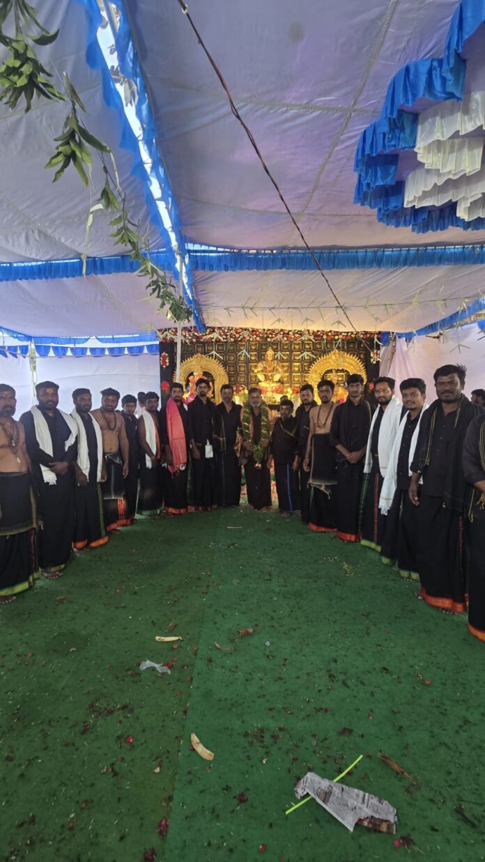 నేటి సాక్షి ప్రతినిధి / డిసెంబర్ 16 చేవెళ్ల న్యూస్ రంగారెడ్డి జిల్లా చేవెళ్ల మండలంలోని కమ్మేట గ్రామంలో మంగళవారం నాడు అయ్యప్ప మహా పడిపూజ జరిగింది ఇట్టి పూజ ఉదయము ఆరు గంటలకు స్వాములు ఇరుముడులు కట్టుకొని అయ్యప్ప స్వామిని భక్తిశ్రద్ధలతో పూజ చేసినారు ఇట్టి పూజ శేఖర్ గురుస్వామి ఆధ్వర్యంలో జరిగింది స్వాముల కోలాటంతో భజన పాటలతో గ్రామంలో అయ్యప్ప స్వాములు రాకతో గ్రామ నలుమూలలో అయ్యప్ప నామస్వరముతో మారుమోగింది స్వాములు పెద్ద సంఖ్యలో వచ్చి అయ్యప్ప స్వామి పూజలో భజన పాటలు పాల్గొని గ్రామ ప్రజలు ఇతర గ్రామాల నుంచి వచ్చిన ప్రజలు గ్రామ పెద్దలు మరియు యువకులు మహిళలు పెద్ద సంఖ్యలో పాల్గొని స్వాముల ఇరుముడి కార్యక్రమంలో పాల్గొని స్వాములందరూ శబరిమలకు 6 గంటలకు బయలుదేరేవరకు గ్రామ ప్రజలు ఇతర గ్రామాల నుంచి వచ్చిన ప్రజలు ఊరి పెద్దలు స్వామివారి తీర్థప్రసాదాలు స్వీకరించి స్వామివారి సేవలో కృప పాత్రులై అయ్యప్ప స్వాములు ఆశీర్వాదం తీసుకున్నారు ఈ కార్యక్రమంలో గ్రామ ప్రజలు మొత్తము పాల్గొని అయ్యప్ప స్వాములు పూజను విజయవంతం చేసినారు వివిధ గ్రామాల నుండి వచ్చిన ప్రజలకు అయ్యప్ప స్వాములు కృతజ్ఞతలు తెలిపినారు
