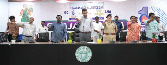 నేటి సాక్షి వికారాబాద్:వికారాబాద్ జిల్లా కలెక్టరేటులోని సమావేశoలో తెలంగాణ సామాజిక న్యాయ దినోత్సవాన్ని పురస్కరించుకొని జిల్లా ఎస్పీ స్నేహ మెహ్రా, జిల్లా అధికారులు, సిబ్బందితో కలిసి జిల్లా కలెక్టర్ ప్రతీక్ జైన్ ప్రతిజ్ఞ చేశారు. ఈ సందర్భంగా జిల్లా కలెక్టర్ మాట్లాడుతూ… భారతదేశానికి స్వాతంత్రం వచ్చినప్పటికీ సామాజికపరంగా, వివక్షతో కూడిన సమాజంలో మార్పు రావాలన్న సదుద్దేశంతో ప్రతి సంవత్సరం ఫిబ్రవరి 4వ తేదీన తెలంగాణ సామాజిక న్యాయ దినోత్సవాన్ని నిర్వహించడం జరుగుతుందన్నారు. ప్రజలందరూ సమానత్వం, న్యాయం, గౌరవం కోసం నిలబడాలని, ఏ రూపంలోనైనా అన్యాయని ఎప్పుడూ సమర్ధించవద్దని కలెక్టర్ సూచించారు. భారతరత్న బాబాసాహెబ్ అంబేద్కర్ ఎన్నో విలువలతో కూడిన రాజ్యాంగాన్ని రూపొందించడం జరిగిందని, రాజ్యాంగ సూత్రాలను సమర్థిస్తూ న్యాయమైన, సామరస్య పూర్వకమైన, సాధికారత కలిగిన తెలంగాణ భారతదేశ కోసం కృషి చేయాల్సిన బాధ్యత మనందరిపై ఉందని ఆయన ఈ సందర్భంగా గుర్తు చేశారు.ఈ కార్యక్రమంలో మున్సిపల్ ఎన్నికల వ్యయ పరిశీలకులు రమేష్, జిల్లా అదనపు కలెక్టర్ రాజేశ్వరి, డిఆర్ఓ మంగీలాల్, ఆర్డీఓ వాసు చంద్ర, డిబిసిడిఓ మాధవ రెడ్డి లతో పాటు వివిధ శాఖల జిల్లా అధికారులు, సిబ్బంది పాల్గొన్నారు.
