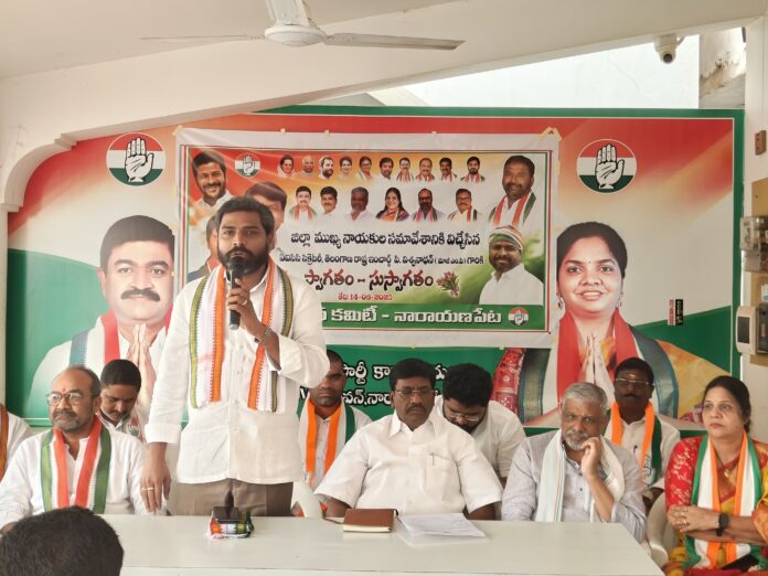నారాయణపేట జిల్లా డిసిసి అధ్యక్షులైన కె.ప్రశాంత్ కుమార్ రెడ్డి ఆధ్వర్యంలో ముఖ్య కార్యకర్తల సమావేశాన్ని నారాయణపేట జిల్లా కాంగ్రెస్ పార్టీ కార్యాలయంలో చేపట్టడం జరిగింది.ఈ యొక్క కార్యక్రమానికి ముఖ్య అతిథులుగా ఏఐసీసీ సెక్రెటరీ తెలంగాణ రాష్ట్ర ఇంచార్జ్, మాజీ ఎంపీ విశ్వనాథన్ ,టీపీసీసీ నారాయణపేట జిల్లా అబ్జర్వర్లు వేణు గౌడ్, సంధ్య రెడ్డి,జై బాబు జై భీమ్ జై సంవిధాన్ కోఆర్డినేటర్ ధారాసింగ్ నాయక్ నారాయణపేట జిల్లా గ్రంథాలయ చైర్మన్ విజయ్ కుమార్ కాంగ్రెస్ నాయకులు సుజేంద్ర శెట్టి పాల్గొన్నారు.