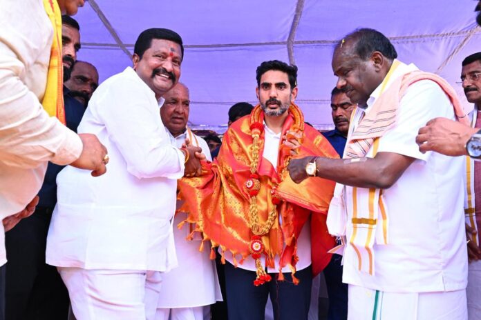 నేటి సాక్షి న్యూస్ ఏప్రిల్ 04 కర్ణాటక రాష్ట్రంలోని సింధనూరు లో సైనిక్ స్కూల్ ప్రారంభోత్సవం మరియు ఎన్టీఆర్ కాంస్య విగ్రహ ఆవిష్కరణ కార్యక్రమాలు ఘనంగా నిర్వహించబడ్డాయి. ఈ కార్యక్రమాలకు హాజరైన గౌరవ విద్య, ఐటీ శాఖ మంత్రి నారా లోకేష్, కేంద్ర ఉక్కు మరియు భారీ పరిశ్రమల శాఖ మంత్రి హెచ్.డి. కుమారస్వామి, కేంద్ర రక్షణశాఖ సహాయ మంత్రి సంజయ్ సేథ్లను మంత్రాలయం తెలుగుదేశం పార్టీ ఇన్చార్జ్ ఎన్. రాఘవేంద్ర రెడ్డి మర్యాదపూర్వకంగా కలిశారు.ఈ సందర్భంగా నాయకులతో భేటీ అయిన రాఘవేంద్ర రెడ్డి, కార్యక్రమం విజయవంతంగా నిర్వహించడంపై అభినందనలు తెలియజేశారు. కార్యక్రమంలో పలువురు నాయకులు, ప్రజాప్రతినిధులు, కార్యకర్తలు పాల్గొన్నారు.