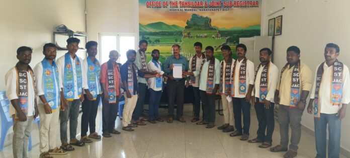 నేటి సాక్షి,నారాయణపేట, నవంబర్ 3,తెలంగాణ రాష్ట్రంలో 50% పైబడి ఉన్న బీసీలకు 42 శాతం రిజర్వేషన్లు ప్రత్యేక చట్టం ద్వారా అమలు చేసి 9వ షెడ్యూల్లో చేర్చి రక్షణ కల్పించకపోతే తెలంగాణ రాష్ట్రంలో స్థానిక ఎన్నికలను అడ్డుకుంటామని మరికల్ మండల బీసీ ఎస్సీ ఎస్టీ జేఏసీ నాయకులు కస్తుల ఆంజనేయులు ముదిరాజు గారు డిమాండ్ చేశారు, కాంగ్రెస్,బిజెపి, బిఆర్ఎస్ అగ్రవర్ణ పార్టీలు బీసీలకు 42% రిజర్వేషన్లు ఇవ్వకుండా కుట్ర చేస్తున్నాయని ఆరోపించారు బీసీలకు స్థానిక ఎన్నికలలో 42% రిజర్వేషన్లతో పాటు విద్యలోనూ ఉపాధిలోను 42 శాతం రిజర్వేషన్లకు చట్టం చేసి ఆ చట్ట రక్షణకై 9వ షెడ్యూల్లో చేర్చాలని బీసీ ఎస్సీ ఎస్టీ – జేఏసీ మరియు ధర్మ సమాజ్ పార్టీ సంయుక్తంగా ఆధ్వర్యంలో మరికల్ మండల అధికారి గారికి వినతి పత్రం సమర్పించడం జరిగింది. ఈ కార్యక్రమంలో బీసీ ఎస్సీ ఎస్టీ జేఏసీ జిల్లా కో కన్వీనర్ నరేష్ ముదిరాజు ,బిసి ఐక్యవేదిక నాయకులు సీతారాం ముదిరాజు , దుంప రాజు ముదిరాజు జిల్లా నాయకులు మరియు ధర్మ సమాజ్ పార్టీ జిల్లా నాయకులు పొర్ల డేవిడ్ , మల్లికార్జున్ మహారాజ్ గారు మరియు ధన్వాడ మండల ధర్మ సమాజ్ పార్టీ అధ్యక్షుడు నరేష్, ఊట్కూరు మండల ధర్మ సమాజ్ పార్టీ నాయకులు వేణు, ఊట్కూరు మండల జేఏసీ నాయకులు, అంజి, కనకం శ్రీనివాసులు, బాలరాజ్,నరేష్, గణేష్ మహారాజ్ అంజి, కొండాపురం రాజు మహారాజ్ తదితరులు పాల్గొన్నారు.