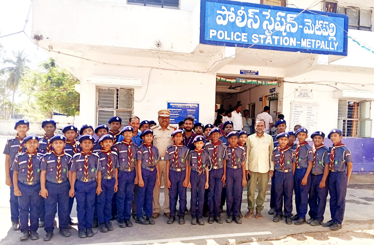 నేటి సాక్షి, మెట్ పల్లి : స్థానిక బస్ డిపో సమీపంలో గల అక్షర హై స్కూల్ విద్యార్థులు స్కౌట్ శిక్షణలో భాగంగా శుక్రవారం మెట్ పల్లి పోలీస్ స్టేషన్ సందర్శించారు. ఈ సందర్భంగా స్థానిక ఎస్సై కిరణ్ కుమార్, టౌన్ టు ఎస్సై రాజు నాయక్ వారితో మాట్లాడుతూ ట్రాఫిక్ నిబంధనలను పాటించడంతోపాటు సామాజిక బాధ్యత ఎలా ఉండాలి క్రమశిక్షణతో ఎలా ఉండాలి అని వివరించారు. ఈ కార్యక్రమంలో కరస్పాండెంట్ కొత్తూరి శ్రీనివాస్, ప్రిన్సిపాల్, విద్యార్థులు మరియు వ్యాయామ ఉపాధ్యాయుడు పాల్గొన్నారు.