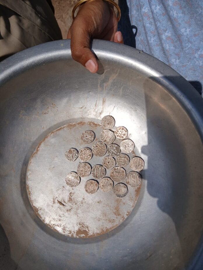 నేటిసాక్షి (కె. గంగాధర్ ) పెగడపల్లి : పెగడపల్లి మండలంలోని, బతికేపల్లి గ్రామ శివారులో పెద్దగుట్ట వద్ద ఉపాధి హామీ పథకంలో భాగంగా పనులు ప్రారంభించిన తర్వాత బతికే పల్లి పెద్దగుట్ట వద్ద కాలువ తవ్వుతుండగా అక్కడ దావుల జమున, మల్యాల శ్యామల అనే వారికి ఉర్దూ భాషలో ఉన్నటువంటి పురాతన కాలం నాటి సుమారుగా 20 వెండి నాణాలు బయటపడినాయి. వెంటనే అక్కడ ఉన్న పంచాయతీ కార్యదర్శి పోలీసులకు సమాచారం అందించగా అక్కడికి పెగడపల్లి ఎంపీడీవో శ్రీనివాస్ రెడ్డి పెగడపల్లి ఎస్ఐ రవి కిరణ్ మరియు రెవెన్యూ ఇన్స్పెక్టర్ జమున మరియు పోలీసు కానిస్టేబుల్ సంపత్ బతికేపల్లి గ్రామంలోని పెద్దగుట్ట వద్దకు చేరుకొని ఆర్ ఐ జమున సమక్షంలో పంచనామ నిర్వహించి అట్టి నాణాలు స్వాధీనం చేసుకొని పురావస్తు శాఖ వారికి అప్పగించడం జరిగిందని తెలియజేయడం జరిగింది.