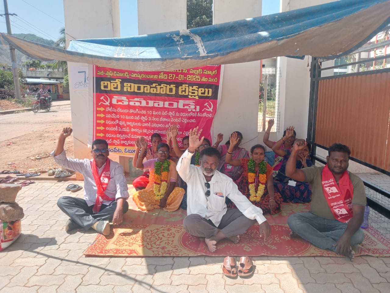 నేటి సాక్షి అన్నమయ్య జిల్లా ప్రతినిధి భక్త కుమార్ : ఏపీ ఎండిసీ పబ్లిక్ స్కూల్ సబ్ స్టాప్, తొలగించిన యాజమాన్యానికి నిరసనగా, ఓబులవారిపల్లి మండలం, మంగంపేట స్కూల్ గేటు వద్ద, గత నెల రోజులు పైగా, ధర్నాలు, రిలే దీక్షలు చేస్తున్న, ప్రిన్సిపల్ ఎంప్లాయ్ గా, ఏపీఎండిసి, ఎండి గాని, సిపిఓ గాని స్పందించకపోవడం, అన్యాయమని సిపిఐ ఎంఎల్( లిబరేషన) జిల్లా నాయకులు, సిగి చెన్నయ్య ఆరోపించారు. సోమవారం దీక్ష శిబిరాన్ని సందర్శించి వారి న్యాయమైన కోర్కెలకు సంపూర్ణ మద్దతు ప్రకటిస్తున్నట్లు తెలిపారు. మూడు సంవత్సరాల నుంచి నిర్వాసితులుగా పాఠశాలలో పనిచేస్తున్న వారిని కొత్త కాంట్రాక్టర్, ఉషోదయ, ఎడ్యుకేషన్, సొసైటీ కాంట్రాక్టర్, అక్రమ పద్ధతిలో అగ్రిమెంట్ తెచ్చుకొని మూడు నెలలు పని పని చేయించుకొని జీతం అడిగితే ఎటువంటి నోటీసు లేకుండా నిర్దాక్షిణ్యంగా తొలగించడం దుర్మార్గం అన్నారు. తక్షణం వారిని డ్యూటీ లోకి తీసుకోవాలని, వారి మూడు నెలల జీతాలు చెల్లించాలని డిమాండ్ చేశారు. ఈ కార్యక్రమంలో మండల నాయకులు, జయసింహ, హరి, తదితరులు పాల్గొన్నారు.