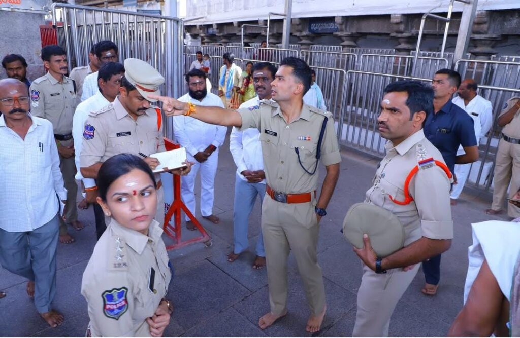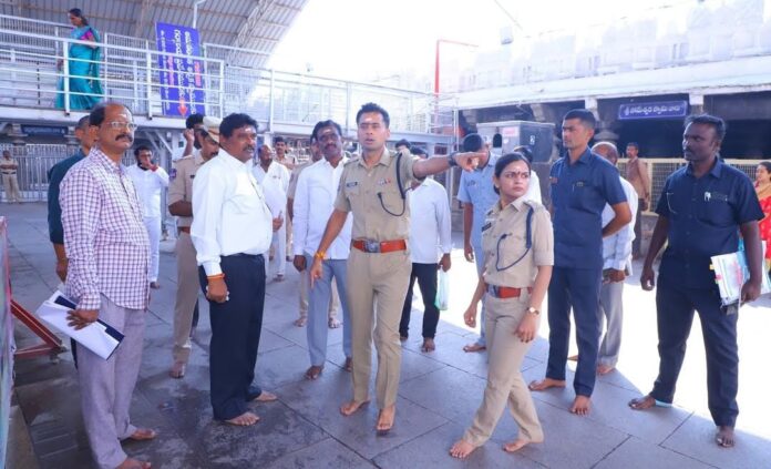 నేటి సాక్షి ప్రతినిధి, వేములవాడ (కొక్కుల వంశీ): మహా శివరాత్రి జాతర సందర్భంగా ప్రధాన ఆలయ ప్రాంగణంలో, పార్కింగ్ ప్రదేశాల్లో, ఆలయంలోకి వచ్చి వెళ్లే దారులు,క్యూ లైన్లలో, కళ్యాణ కట్ట, ధర్మ గుండం, ఆలయ ప్రాంగణంలో చేస్తున్న ఏర్పాట్లను పోలీస్ , ఆలయ అధికారులతో కలసి జిల్లా ఎస్పీ అఖిల్ మహాజన్ పరిశీలించి పలు సూచనలు, సలహాలు చేశారు. ఈ సందర్భంగా జిల్లా ఎస్పీ అఖిల్ మహాజన్ మాట్లాడుతూ…ఈ నెల 25 నుంచి 27వ తేదీ వరకు నిర్వహించనున్న మహా శివరాత్రి జాతర వేడుకలలో ఎలాంటి అవాంఛనీయ సంఘటనలు జరగకుండా, వివిధ ప్రాంతాల నుండి వచ్చే భక్తులకు ఎటువంటి ఇబ్బందులు తలెత్తకుండా గత అనుభవాలను దృష్టిలో ఉంచుకొని పకడ్బందీగా జాతర ఏర్పాట్లను నిర్వహించాలని అధికారులను ఆదేశించారు. గతంతో పోల్చుకుంటే ఈ సంవత్సరం భక్తుల సంఖ్య పెరిగే అవకాశం ఉన్నందున వివిధ ప్రాంతాల నుండి వచ్చే వారి వాహనాల పార్కింగ్ నిమిత్తం గత సంవత్సరం కంటే ఎక్కువ పార్కింగ్ ప్రదేశాలు ఏర్పాటు చేయాలని పార్కింగ్ ప్రదేశాల్లో విధులలో ఉన్న సిబ్బందికి టెంట్ మంచి నీటి సదుపాయలు కలిగించాలన్నారు. పట్టణ కేంద్రంలో ట్రాఫిక్ సమస్యలు తలెత్తకుండా ట్రాఫిక్ డ్రైవర్షన్ల వద్ద సూచిక బోర్డ్స్,ఫ్లెక్సీలు ఏర్పాటు చేయాలని సూచించారు. శివరాత్రి జాతర సందర్భంగా ఎలాంటి అవాంఛనీయ సంఘటనలు జరగకుండా పటిష్ట భద్రత చర్యలు తీసుకోవడం జరుగుతుందని, ప్రధాన అలయంతో పాటుగా అనుబంధ దేవాలయాల వద్ద ,పార్కింగ్ ప్రదేశాల వద్ద,శివార్చన ప్రదేశంలో,ట్రాఫిక్ జంక్షన్ ల వద్ద పటిష్ట బందోబస్తు ఏర్పాటు చేయాలని ఆదేశించారు. ఎస్పీ వెంట వేములవాడ ఏఎస్పీ శేషాద్రిని రెడ్డి, స్పెషల్ బ్రాంచ్ డిఎస్పీ మురళి కృష్ణ, సి.ఐ లు వీరప్రసాద్, శ్రీనివాస్, స్పెషల్ బ్రాంచ్ సి.ఐ శ్రీనివాస్,మున్సిపల్ కమిషనర్ అన్వేష్, ఆలయ ఈ. ఓ వినోద్, ఆలయ ఈ. ఈ రాజేష్, డి. ఈ మహిపాల్ రెడ్డి, ఏఈఓ శ్రవణ్ కుమార్, ఏఈ రామ్ కిషన్ రావు, ఎస్.ఐ లు ప్రేమనందం, రాజు, సిబ్బంది, ఆలయ సిబ్బంది పాల్గొన్నారు.