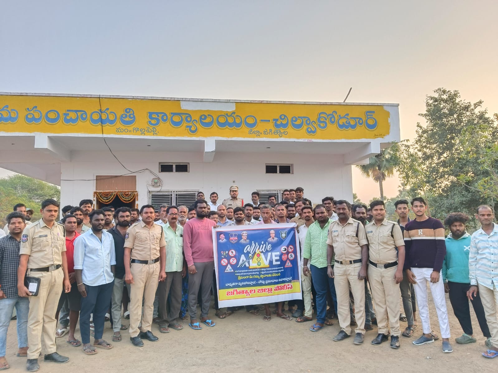 నేటి సాక్షి, జగిత్యాల ప్రతినిధి:* ( గుండ ప్రశాంత్ గౌడ్ )Arrive Alive రోడ్డు భద్రత కార్యక్రమం లో భాగంగా జగిత్యాల జిల్లా ఎస్పీ అశోక్ కుమార్ ఆదేశాల మేరకు జగిత్యాల డిఎస్పి రఘు చందర్ సూచనలతో ధర్మపురి సీఐ రామ్ నర్సింహారెడ్డి ఆధ్వర్యంలో గొల్లపల్లి మండలం చిలువకోడూరు గ్రామంలో మంగళవారం రోజున నుండి 10 రోజుల పాటు నిర్వహించనున్న Arrive Alive రోడ్డు భద్రత కార్యక్రమాన్ని ప్రారంభించారు. ఈ కార్యక్రమంలో గొల్లపల్లి ఎస్సై కృష్ణ సాగర్ రెడ్డి మాట్లాడుతూ రోడ్డు భద్రత పట్ల అవగాహన కల్పిస్తూ తగిన సూచనలు తెలియజేశారు. రోడ్డుపైన ప్రయాణించే ప్రతి వాహనదారుడు తప్పనిసరిగా హెల్మెట్ ధరించి వాహనం నడపాల్సిన సూచిస్తూ, ప్రతి ఒక్కరు రోడ్డు భద్రత పట్ల అవగాహన ఏర్పాటు చేసుకోవాలని తెలియజేశారు. ఇట్టి కార్యక్రమంలో చిలువకోడూర్ గోవిందపల్లి దట్నూర్ చందోలి గ్రామల సర్పంచులు చిలువకోడూర్ గ్రామ ప్రజలు సుమారు 60 మంది మరియు గొల్లపల్లి పోలీస్ సిబ్బంది హాజరైనారు.