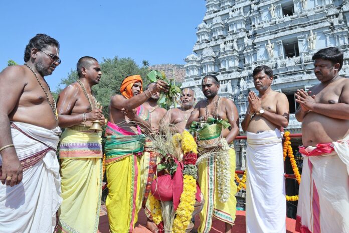 నేటి సాక్షి తిరుపతి జిల్లా (బాదూరు బాల) : తిరుపతి అలిపిరి పాదాల మండపం వద్ద గల శ్రీ వేంకటేశ్వరస్వామివారి ఆలయం, శ్రీ లక్ష్మీ నారాయణస్వామి వారి ఆలయానికి అనుబంధంగా ఉన్న శ్రీ గోదా అమ్మవారి ఆలయంలో సోమవారం ఉదయం అష్టబంధన మహా సంప్రోక్షణ కార్యక్రమాలు శాస్త్రోక్తంగా నిర్వహించారు. ఇందులో భాగంగా సోమవారం ఉదయం 6 నుండి 7.30 గంటల వరకు యాగశాలలో వైదిక కార్యక్రమాలు, మహా పూర్ణాహుతి నిర్వహించారు. ఉదయం 7:30 నుండి 8:30 గంటల వరకు కుంభ ప్రదక్షణ, ఉదయం 9.45 నుండి 10.25 గంటల మధ్య వృషభ లగ్నంలో కళావాహనము అక్షతారోహణం మహా సంప్రోక్షణ నిర్వహించారు. గర్భాలయంలో జీర్ణోద్ధరణ కోసం మార్చి 1 నుండి 3వ తేదీ వరకు ”బాలాలయం” సంప్రోక్షణ నిర్వహించిన విషయం తెలిసిందే. ఇందుకోసం ఆలయంలోని ముఖ మండపంలో నమూనా ఆలయం ఏర్పాటు చేసి గర్భాలయంలోని మూలవర్ల చిత్రపటాలను ఏర్పాటు చేశారు. ఈ కార్యక్రమంలో ఆలయ డిప్యూటీ ఈవో శాంతి, రుత్వికులు, ఇతర అధికారులు పాల్గొన్నారు.