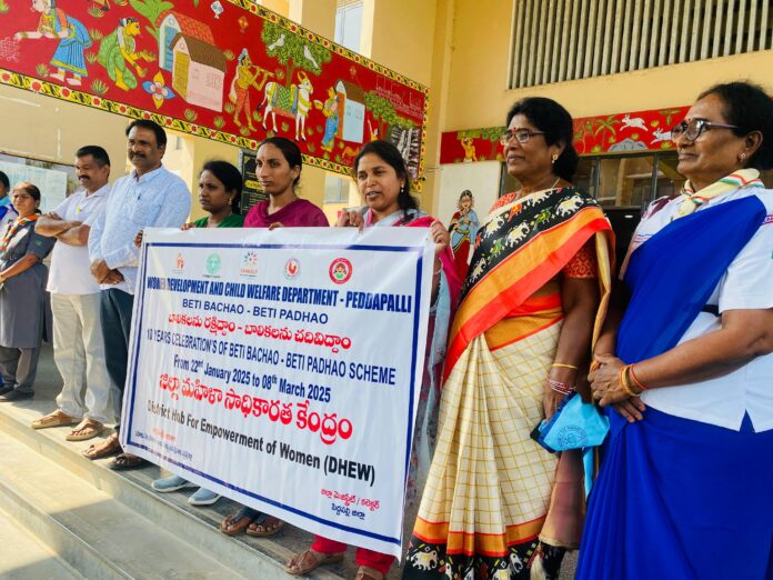 ప్రధానమంత్రి నరేంద్ర మోడీ జనవరి 22 2015 న ప్రారంభించినటువంటి బేటి బచావో- బేటి పడావో స్కీం నేటికీ దశాబ్ది కాలం అవుతున్న సందర్భంగా జిల్లా సంక్షేమ అధికారి పి. వేణుగోపాల్ మహిళా సాధికారత కేంద్ర బృందం చేత ఈనెల 22 నుండి మార్చి 8 వరకు జిల్లాలలో వివిధ కార్యక్రమాలు చేపట్టనున్నారు. ఈ కార్యక్రమాన్ని పురస్కరించుకొని నేడు పెద్దపల్లి పట్టణంలోని వివిధ పాఠశాల విద్యార్థుల చేత ప్రతిజ్ఞ ఆడపిల్లల సంరక్షణ పై అవగాహన కల్పించారు మరియు గవర్నమెంట్ ఆసుపత్రి నందు సంతకాల సేకరణ కార్యక్రమం నిర్వహించారు .ఈ కార్యక్రమంలో మహిళా సాధికారత కేంద్రం కోఆర్డినేటర్ దయ అరుణ, ఫైనాన్షియల్ లిటరసీ.ఎస్.సంధ్య ఆసుపత్రి డాక్టర్లు సూపెరిoడెంట్, లయన్స్ క్లబ్ మెంబర్లు డిసిపిఓ కమలాకర్, చైల్డ్ లైన్ కోఆర్డినేటర్ ఉమాదేవి, సఖి సిఏ స్వప్న పోషణ, అభియాన్ కోఆర్డినేటర్ అనిల్ కుమార్ , ఐ సి పి ఎస్ బృందం, ఐ సి డి ఎస్ బృందం, కమ్యూనిటీ ఎడ్యుకేటర్లు, తదితరులు పాల్గొన్నారు.