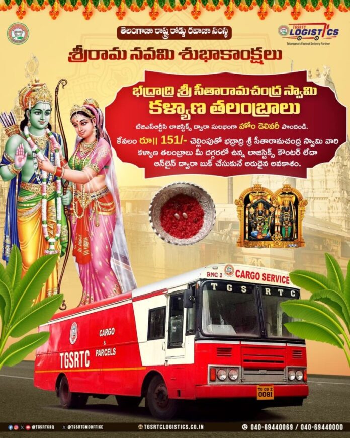 నేటి సాక్షి, హుజురాబాద్ ఆర్.సి (రాఘవుల శ్రీనివాసు): శ్రీరామ నవమి సందర్భంగా భద్రాచలంలోని శ్రీ సీతారామచంద్రుల కల్యాణ తలంబ్రాలను కోరుకున్న భక్తుల ఇళ్లకు చేర్చాలని టీజీఎస్ఆర్టీసీ యాజమాన్యం నిర్ణయించింది. ఎప్పటిలాగానే ఈ సారి కూడా తెలంగాణ దేవాదాయ శాఖ సహకారంతో రాములోరి కల్యాణ తలంబ్రాలను హోం డెలివరీ చేసే పవిత్ర కార్యానికి సంస్థ శ్రీకారం చుట్టింది. తలంబ్రాలు కావాల్సిన భక్తులు టీజీఎస్ఆర్టీసీ లాజిస్టిక్స్ కేంద్రాలలో రూ.151 చెల్లించి.. వివరాలను నమోదు చేసుకోవాలి. శ్రీ సీతారామచంద్రుల కల్యాణోత్సవం అనంతరం ఈ తలంబ్రాలను భక్తులకు సంస్థ హోం డెలివరీ చేస్తుంది. హుజురాబాద్ డిపో లో మంగళవారం భద్రాద్రి శ్రీ సీతారాముల కల్యాణ తలంబ్రాల బుకింగ్ పోస్టర్ను టీజీఎస్ఆర్టీసీ డిపో మేనేజర్ రవీంద్రనాథ్ గారు ఆవిష్కరించి.. తలంబ్రాల బుకింగ్ను ప్రారంభించారు. భద్రాద్రిలో ఏప్రిల్ 6న అంగరంగ వైభవంగా జరిగే శ్రీరామనవమి వేడుకలకు వెళ్లలేని భక్తులు ఈ సేవల్ని వినియోగించుకోవాలని టీజీఎస్ఆర్టీసీ కోరుతోందని డిపో మేనేజర్ రవీంద్రనాథ్ అన్నారు. రాష్ట్రంలోని అన్ని లాజిస్టిక్స్ కౌంటర్లతో పాటు ఆన్లైన్ ద్వారా కూడా తలంబ్రాలను బుక్ చేసుకోవచ్చని చెప్పారు. డిపో మార్కెటింగ్ ఎగ్జిక్యూటివ్ చంద్ర మౌళి వద్ద నేరుగా ఆర్డర్లను స్వీకరిస్తారని తెలిపారు. తలంబ్రాల సేవను పొందాలనుకునే భక్తులు టీజీఎస్ఆర్టీసీ మార్కెటింగ్ ఎగ్జిక్యూటివ్ చంద్ర మౌళి : 9154298559, హుజురాబాద్ కౌంటర్ : 9281471199, జమ్మికుంట కౌంటర్ : 9014363256 ఫోన్ నంబర్లైను సంప్రదించాలని సూచించారు. ఈ కార్యక్రమంలో డిపో మేనేజర్ రవీంద్రనాథ్ డిపో మార్కెటింగ్ ఎగ్జిక్యూటివ్ చంద్ర మౌళి, రవీందర్ రెడ్డి సెక్యూరిటీ హెడ్ కానిస్టేబుల్ ఆఫీస్ సూపరిండెంట్(P), అకౌంటెంట్ (F), రమేష్ బాబు(ADC), రాజేశం (RT), రమేష్ సిస్టం సూపర్ వైజర్ తదితరులు పాల్గొన్నారు.