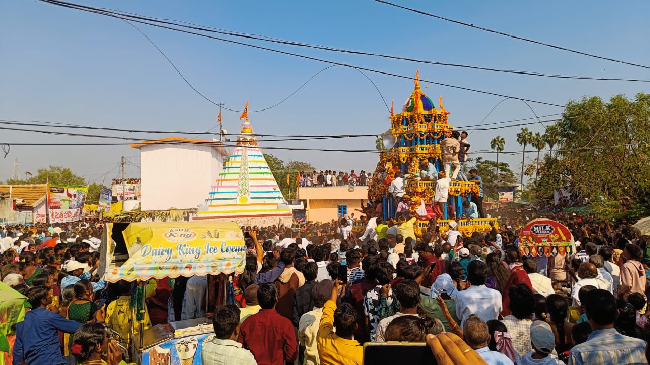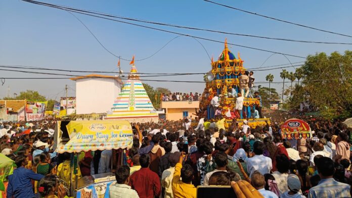 నేటిసాక్షి, రాయికల్ : రాయికల్ పట్టణంలోని ప్రాచీన చరిత్ర కలిగిన శ్రీ భీమేశ్వరస్వామి ఆలయంలో మూడు రోజులుగా జరుగుతున్న జాతర ఉత్సవాలు శుక్రవారం సాయంత్రం ముగిసాయి. ఆలయానికి ఉదయం నుండే భక్తులు తరలివచ్చి పూజలు నిర్వహించి స్వామివారిని దర్శించుకొని తమ మ్రొక్కుల్ని చెల్లించుకున్నారు. రాయికల్, మేడిపెల్లి, సారంగాపూర్, మల్లాపూర్, కొరుట్ల, జగిత్యాల ప్రాంతాల నుండి తరలివచ్చిన భక్తుల సమక్షంలో కన్నుల పండువగా రథోత్సవం సాగింది. స్వామివారిని ప్రత్యేకంగా అలకంరించి రథంపై ఆసీనులు చేసి పోటీ పడుతూ భక్తులు ఆలయం చుట్టూ రథాన్ని ఐదుసార్లు త్రిప్పారు. రథం ముందు దావత్ పూజరుల విన్యాసాలు భక్తులను అలరించాయి. అంతకుముందు జగిత్యాల ఎమ్మెల్యే డాక్టర్ సంజయ్కుమార్ పూజలు నిర్వహించారు. ఆలయ వంశీయులు దేవుని చిన్న రాజం, భీమన్న యూత్ సభ్యులు, మున్నూరుకాపు యూత్ సభ్యులు జాతరలో భక్తులకు ఏలాంటి ఇబ్బందులు తలేత్తకుండా చర్యలు చేపట్టారు. రాయికల్ ఎస్ఐ సుధీర్రావు ఆధ్వర్యంలో పోలీసులు బందోబస్తు నిర్వహించారు.