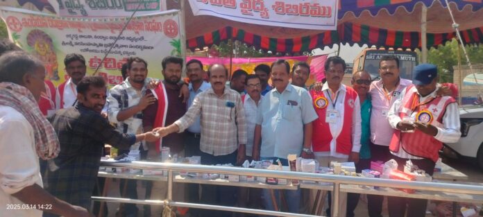 నేటి సాక్షి ప్రతినిధి ఆళ్లగడ్డ: ప్రముఖ పుణ్యక్షేత్రమైన అహోబిలంలో బ్రహ్మోత్సవాల సందర్భంగా శుక్రవారం ఇండియన్ రెడ్ క్రాస్ సొసైటీ, ఆళ్లగడ్డ తాలూకా గ్రామీణ వైద్యుల సంక్షేమ సంఘం ఆధ్వర్యంలో ఏర్పాటుచేసిన ఉచిత మెగా వైద్య శిబిరాన్ని టీడీపీ యువ నాయకుడు భూమా జగత్ విఖ్యాత్ రెడ్డి ప్రారంభించారు. ఈ సందర్భంగా విఖ్యాత్ రెడ్డి మాట్లాడుతూ అహోబిలం క్షేత్రంలో వైద్య శిబిరాన్ని ఏర్పాటుచేసిన గ్రామీణ వైద్యులను, రెడ్ క్రాస్ సొసైటీ సంస్థ ప్రతినిధులను భూమా అభినందించారు. ప్రతి ఏటా ఇక్కడ ఉచిత వైద్య శిబిరాన్ని ఏర్పాటు చేసి రోగులకు సేవలు అందిస్తున్నారని కొనియాడారు. రథోత్సవం సందర్భంగా ఊరంతా పండుగ వాతావరణం నెలకొందన్నారు. రాష్ట్ర ముఖ్యమంత్రి చంద్రబాబు, లోకేష్ బాబుకు, టీడీపీ నాయకులకు, ఈరోజు ప్రజలు అంతా సుఖశాంతులతో జీవించాలని భూమా ఆకాంక్షించారు. వైద్య శిబిరం ఏర్పాటు చేసిన గ్రామీణ వైద్యులకు తమ సహాయ సహకారాలు కోరితే తప్పకుండా అందిస్తామని భూమా విఖ్యాత్ రెడ్డి తెలిపారు. బ్రహ్మోత్సవాలకు దేవుని దర్శించుకునేందుకు వచ్చిన వేలాదిమంది భక్తులకు గ్రామీణ ఆళ్లగడ్డ గ్రామీణ వైద్యుల సంఘం వైద్యులు ప్రైమ్ కేర్ హాస్పిటల్ సహకారంతో , ఫ్రేమ్ కేర్ హాస్పిటల్ మేనేజర్ శేఖర్ బిపి షుగర్ తదితర రక్త పరీక్షలు అనంతరం వైద్యులురోగులకు ఉచితంగా మందులు పంపిణీ చేశారు. ఈ కార్యక్రమంలో సొసైటీ చైర్మన్ పర్ల దస్తగిరి, రెడ్ క్రాస్ సంస్థ సభ్యులు వెంకటేశ్వర్లు, విజయ కాంత్ రెడ్డి తిరుపాల్ ఈశ్వర్ వీరేష్ గురప్ప శ్రీనివాసులు మద్దిలేటి యోగి, దొర్నిపాడు మండల గ్రామీణ వైద్యుల సంఘం నాగేంద్ర ,నంద్యాల రెడ్ క్రాస్ సంస్థ సభ్యులు నాగేశ్వర్ రెడ్డి నాగేశ్వరరావు తదితరులు పాల్గొన్నారు.