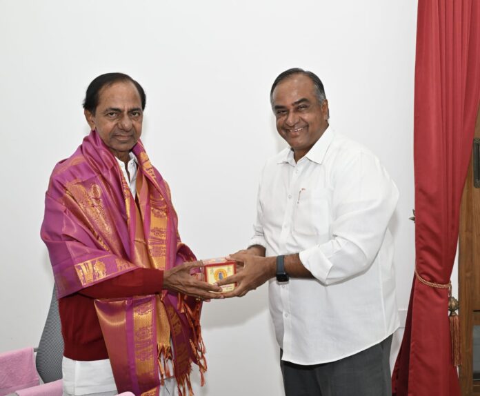 నేటి సాక్షి ప్రతినిధి, వేములవాడ : తెలంగాణ తొలి ముఖ్యమంత్రి కల్వకుంట్ల చంద్ర శేఖర్ రావును శనివారం ఎర్రవెల్లి లోని ఫామ్ హౌస్ లో బిఆర్ఎస్ పార్టీ వేములవాడ నియోజకవర్గ ఇన్చార్జి చల్మెడ లక్ష్మీనరసింహారావు మర్యాదపూర్వకంగా కలిశారు. ఈ సందర్భంగా వేములవాడ శ్రీ రాజరాజేశ్వర స్వామి ప్రసాదం అందజేసి నూతన సంవత్సర,సంక్రాంతి శుభాకాంక్షలు తెలియజేశారు.