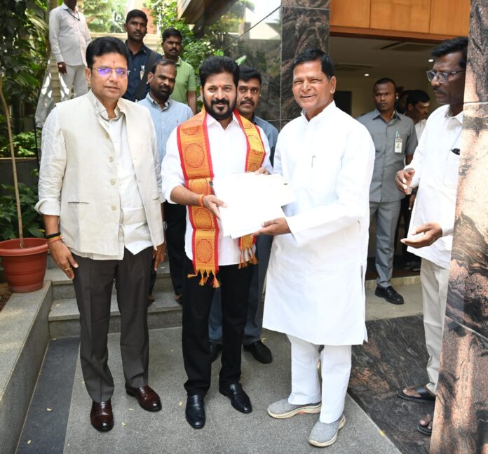 - అభివృద్ధి కార్యక్రమాలపై ముఖ్యమంత్రి ఏ. రేవంత్ రెడ్డి కి వినతి పత్రాన్ని అందజేత