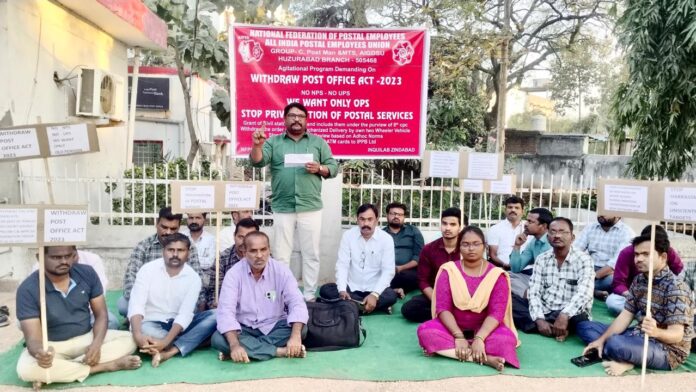 పోస్టల్ జాయింట్ యాక్షన్ కమిటీ నిర్ణయం మేరకు ఈరోజు హుజురాబాద్ ప్రధాన తపాల కార్యాలయం ఎదుట ధర్నా కార్యక్రమాన్ని ఏర్పాటు చేయడం జరిగింది. ఈ కార్యక్రమంలో ముఖ్యఅతిథిగా అఖిలభారత తపాల ఉద్యోగుల సంఘం రాష్ట్ర అధ్యక్షులు యు మహేందర్ మాట్లాడుతూ తపాల శాఖలో ప్రవేశపెడుతున్న నూతన సంస్కరణల వల్ల తపాల వ్యవస్థ నిర్వీర్యం కాబోతుందని ఉద్యోగులకు తీవ్ర నష్టం జరుగుతుందని తెలిపారు. పోస్ట్ ఆఫీస్ చట్టం 2023 ప్రకారం తపాల శాఖలో తీసుకుంటున్న నూతన సంస్కరణల ద్వారా ప్రవేశపెడుతున్న ఇంటిగ్రేటెడ్ డెలివరీ సెంటర్ ల ద్వారా పోస్ట్ మెన్ స్టాఫ్ తగ్గిపోతుందని మెకానైజ్డ్ డెలివరీ సిస్టం ద్వారా పోస్ట్ మెన్ ఉద్యోగులకు భద్రత లేనటువంటి విధానాన్ని ప్రవేశపెట్టి రోడ్డు మైలేజీ కిలోమీటర్ కు 98 పైసలు చెల్లించి వారిని తీవ్ర ఒత్తిడికి గురిచేయడాన్ని ఖండిస్తున్నామని, ఈమధ్య ప్రవేశపెట్టిన యూనిఫైడ్ పెన్షన్ సిస్టంను వ్యతిరేకిస్తున్నామని ఓల్డ్ పెన్షన్ స్కీమ్ పునరుద్ధరణ చేసేంతవరకు ఉద్యోగుల పోరాటం నిరంతరమని, ఎనిమిదవ వేతన కమిటీ ద్వారా ఉద్యోగులకు క్యాడర్ చేసి గ్రేడ్ పే పెంచాలని, నిత్యావసరాల ధరలను దృష్టిలో పెట్టుకొని కనీస వేతనాన్ని 18,000/- నుండి 45,000/- రూపాయలకు పెంచాలని ఎనిమిదవ వేతన కమిటీలో గ్రామీణ డాక్ సేవకులను తీసుకొని వారికి సివిల్ సర్వెంట్ హోదాను కల్పించి పెన్షన్, మెడికల్ బెనిఫిట్స్ కల్పించాలని డిమాండ్ చేయడం జరిగింది. అదేవిధంగా పోస్ట్ ఆఫీస్ ఖాతాలకు సంబంధించి ఏటీఎం కార్డ్స్ ను ఐపిపిబి కి తరలించడానికి వ్యతిరేకిస్తున్నామని ఈ మధ్యకాలంలో చేపట్టినటువంటి ఎస్టాబ్లిష్మెంట్ రివ్యూ ద్వారా తపాలా శాఖలో పనిచేస్తున్నటువంటి ఉద్యోగుల పైన తీవ్ర ఒత్తిడి నెలకొందని ఇలాంటి వ్యతిరేకమైనటువంటి మార్పుల ద్వారా డిపార్ట్మెంట్ కు తీవ్ర నష్టం చేకూరుతుందనీ తెలుపుతూ, ఈ వ్యతిరేక విధానాల ప్రశ్నించేటువంటి సంఘాలను గుర్తింపు రద్దు చేయడాన్ని తీవ్రంగా పరిగణిస్తు, రాంచి హైకోర్టు ఇచ్చిన తీర్పును వెంటనే అమలు చేయాలని ప్రభుత్వాన్ని డిమాండ్ చేయడం జరిగింది. ఈ కార్యక్రమంలో పోస్టల్ జాయింట్ కౌన్సిల్ ఆఫ్ యాక్షన్ నాయకులు కామ్రేడ్ పి రవికుమార్, జై రజనీకాంత్, తిరుపతి నాయక్, ఏ అనిల్ కుమార్, రాజమౌళి, ప్రవీణ్, చంద్రమోహన్, వేణు, సందీప్, శ్రీనివాస్, సమ్మురాజు, మీస తిరుమలేష్, ఎండి రఫీ, హరీష్ అనిల్, గౌరవ్, స్వామి, సతీష్, ఎర్ర రాజు, అపూర్వ, శివాజీ, రాజేష్, సాయి, సత్యం రాము తదితరులు పాల్గొన్నారు.