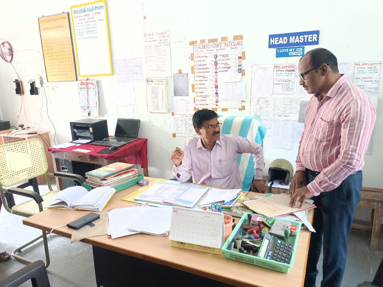 నేటి సాక్షి, కొడిమ్యాల : కొడిమ్యాల మండలంలోని పూడూరు గ్రామంలో బుధవారం జెడ్పిహెచ్ఎస్ ఉన్నత పాఠశాలను జిల్లా విద్యాధికారి రాము సందర్శించారు. పాఠశాలలోని రిజిస్టర్లు రికార్డులు పరిశీలించి ఉపాధ్యాయులు రాస్తున్న డైరీలను పరిశీలించారు. పదవ తరగతి విద్యార్థుల యొక్క స్థాయిని అడిగి తెలుసుకున్నారు. విద్యార్థులను ఉపాధ్యాయులందరికీ దత్తత ఇచ్చిన విషయాన్ని తెలుసుకున్నారు. విద్యాభివృద్ధి కోసం పాఠశాలలో అమలుపరుచుతున్న కార్యక్రమాలను అడిగి తెలుసుకుని పదవ తరగతి లో అత్యున్నత ఉత్తీర్ణత సాధించుటకు ఉపాధ్యాయులకు సూచనలు సలహాలు అందించ్చి మధ్యాహ్న భోజన వివరాలు తెలుసుకొని జిల్లాలో అమలుపరచుచున్న అపార్ యొక్క స్థాయిని తెలుసుకున్నారు.