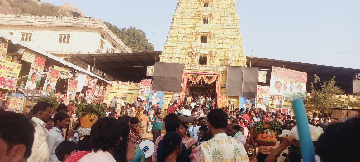 నేటి సాక్షి చేర్యాల, జనవరి 19 : తెలంగాణ రాష్ట్రంలో ప్రముఖ పుణ్యక్షేత్రాలలో ఒకటైన కొమరవెల్లి మల్లన్న ఆలయానికి భక్తులు పోటెత్తారు.కోరిన కోర్కెలు తీర్చే కొంగుబంగారంగా విరాజిల్లుతున్న కోర మీసాల మల్లన్న ను దర్శించుకోవడానికి జంట నగరాల నుంచి అధిక సంఖ్యలో భక్తులు తరలివచ్చారు. మల్లన్న నామస్మరణతో ఆలయ పరిసర ప్రాంతాలు మారుమోగాయి. ఆలయానికి నలుమూలల ప్రాంతాలు జనసంద్రంగా మారాయి. స్వామివారిని దర్శించుకోవడానికి సుమారు నాలుగు ఐదు గంటల సమయం పట్టింది.ప్రతి ఏటా బ్రహ్మోత్సవాల్లో మొదటి ఆదివారం గా పిలవబడే పట్నం వారానికి హైదరాబాదు నుండి భక్తులు తరలివస్తారు. శనివారం నుండే భక్తులు తరలివచ్చి సోమవారం వరకు ఇక్కడే బస చేస్తారు. ఆదివారం రాత్రి తోటబావి వద్ద హైదరాబాద్ యాదవులు సొంత డబ్బులతో అగ్నిగుండాలను, పెద్ద పట్నాన్ని స్థానిక ఒగ్గు కళాకారులచే రచింప చేస్తారు. అనంతరం సోమవారం ఉదయం వాటిని తొక్కి, భక్తిపారవంశంతో స్వామివారిని దర్శనం చేసుకుంటారు. అనంతరం కొండపోచమ్మ కు బయలుదేరి వెళ్తారు. ఆదివారం ఉదయం తెల్లవారకముందే భక్తులు స్వామివారి పుష్కరణి లో పుణ్యస్నానమాచరించారు. అనంతరం స్వామి వారిని దర్శించుకున్నారు. గంగిరేణి చెట్టు కింద పట్నాలు వేసి, బోనం నైవేద్యంగా సమర్పించి, మొక్కులు చెల్లించుకున్నారు. మధ్యాహ్నం నుంచి గుట్టపైనున్న ఎల్లమ్మ తల్లికి బోనాలు సమర్పించడానికి, డప్పు చప్పులతో, శివసత్తుల పూనకాలతో నెత్తిన బోనాలు ఎత్తుకొని అమ్మవారిని దర్శించుకోవడానికి వెళ్లారు. తల్లికి బోనం సమర్పించారు. .మల్లన్న ఆలయం చుట్టూ ఉన్న రహదారులు చెక్ పోస్టులు ఏర్పాటు చేయడంతో భక్తులు ఇబ్బంది ఇబ్బందులు పడ్డారు. కిలోమీటర్ల మేర సామాన్లను మోసుకుంటు వెళ్లారు. భక్తుల సౌకర్యార్థం ఆలయ వర్గాలు అన్ని ఏర్పాట్లు చేశారు.