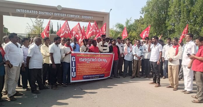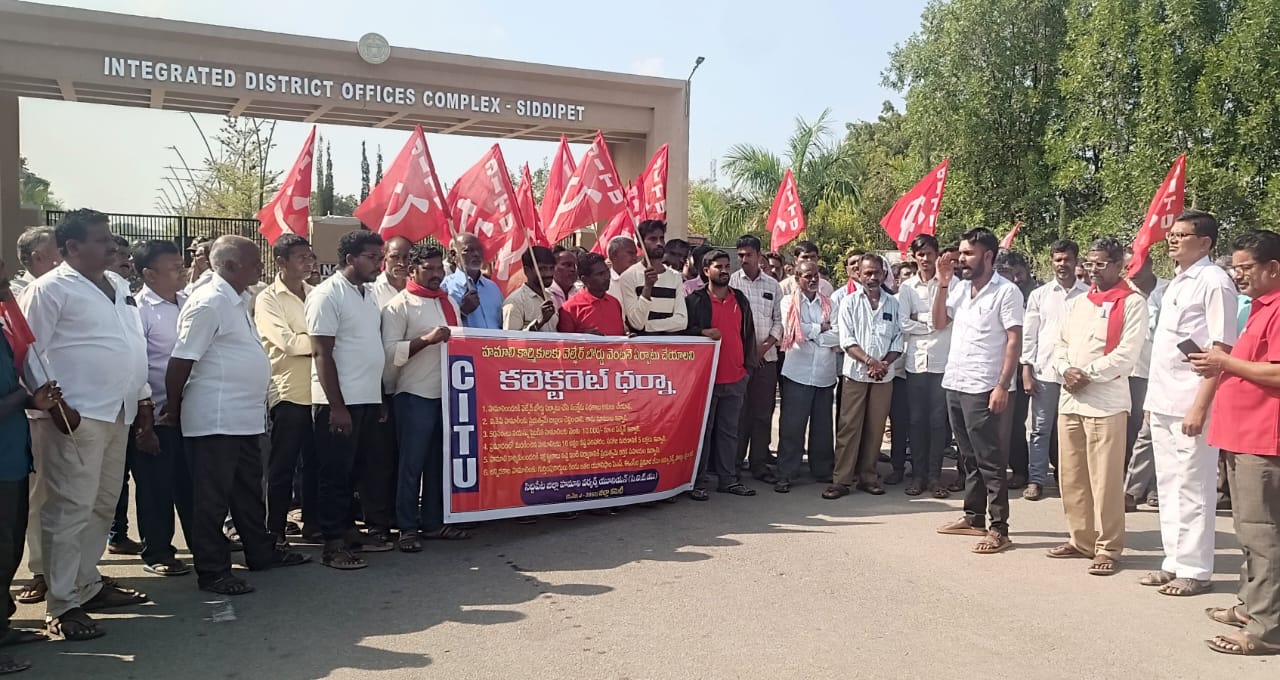 హమాలీ కార్మికుల సమస్యల పరిష్కారం కోసం సిద్ధిపేట జిల్లా కలెక్టర్ కార్యాలయం వద్ద సిఐటీయు ఆధ్వర్యంలో భారీగా కార్మికులు ధర్నా నిర్వహించారు.ఈ సందర్భంగా కార్మికులను ఉద్దేశించి సిపిఎం నాయకుడు తిప్పారపు శ్రీనివాస్ మాట్లాడుతూ హామలిలందరికి వెల్ఫేర్ బోర్డు ఏర్పాటు చేసి సంక్షేమ పథకాలు అమలు చేయాలని కోరారు. కార్మికుల కోసం ప్రభుత్వం తగిన చర్యలు తీసుకోవాలని, పాత పెండింగ్ డిమాండ్లను వెంటనే పరిష్కరించాలని, తక్షణమే ప్రభుత్వం స్పందించి సమస్యలు పరిష్కరించాలని వారు డిమాండ్ చేశారు. సమస్యలు తీరే వరకు తమ ఆందోళన ఆగదని కార్మికులు హెచ్చరించారు.ఈ కార్యక్రమంలో కార్మిక సంఘాల నాయకులు పాల్గొన్నారు.