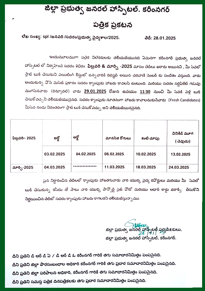 కరీంనగర్ జిల్లా ప్రభుత్వ జనరల్ ఆసుపత్రి వారి సదరం శిబిరం యొక్క ప్రకటన జనవరి 28న విడుదల చేసినట్లు దివ్యాంగ సమాచారం వ్యవస్థాపక అధ్యక్షులు రాఘవుల శ్రీనివాసు పత్రిక ప్రకటన ద్వారా తెలిపారు. ఈ శిబిరంలో 2025 ఫిబ్రవరి, మార్చి నెలలలో నిర్ణయించబడిన తేదీ లలో స్లాట్ బుక్ చేసుకుని వెయిటింగ్ లిస్టులో ఉన్న దివ్యాంగులు తమకు కేటాయించిన తేదీలలో హాజరుకావాలని తెలిపారు. స్లాట్ బుకింగ్ చేసుకున్న వారి ఫోన్ నెంబర్లకు మెసేజ్ వస్తుందని అన్నారు. తమ తమ వైద్య రిపోర్టులు ఎక్స్రేలు బుకింగ్ చేసుకున్న రసీదు నంబర్లు ఆధార్ కార్డు మొదలగు కాఫీలు వెంట తీసుకెళ్లాలని అన్నారు. మీయొక్క సదరం వ్యాలిడిటీ గడిచిపోయినట్లయితే రెన్యువల్ కొరకు జనవరి 29 తేదీన ఉదయం 11 గంటల నుండి మీ ప్రాంతీయ మీసేవ కార్యాలయాలలో స్లాట్ బుకింగ్ చేసుకోవాలని ప్రకటనలో వెల్లడించినట్లు తెలిపారు. కొత్తగా సదరం సర్టిఫికెట్ పొందగోరు వారు తమ తమ ప్రాంతీయ మీసేవ కార్యాలయాలలో స్లాట్ బుకింగ్ చేసుకోవాలని చెప్పారు. నూతన స్లాట్ బుకింగ్ ప్రక్రియ నిరంతరంగా కొనసాగుతుందని ప్రత్యేకమైన తేదీలు ఏవి ఉండబోవని అన్నారు. ఆర్థోపెడిక్ వారికి ఫిబ్రవరి 3,4, మార్చి 4 తేదీలలో, మానసిక రోగులకు ఫిబ్రవరి 6, మార్చి 11 తేదీలలో, కంటి చూపు ఫిబ్రవరి 10, మార్చి 18 తేదీలలో, వినికిడి మూగ చెవిటి వారు ఫిబ్రవరి 13, మార్చి 24 తేదీలలో తమ తమ పత్రాలతో హాజరుకావాలని అన్నారు. దివ్యాంగ మిత్రుడు అందరూ ఇట్టి సదవకాశాన్ని వినియోగించుకోవాలని దివ్యాంగ సమాచారం వ్యవస్థాపక అధ్యక్షులు కోరారు.