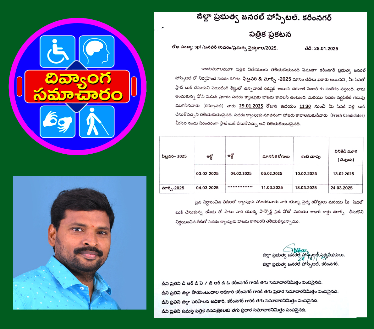 కరీంనగర్ జిల్లా ప్రభుత్వ జనరల్ ఆసుపత్రి వారి సదరం శిబిరం యొక్క ప్రకటన జనవరి 28న విడుదల చేసినట్లు దివ్యాంగ సమాచారం వ్యవస్థాపక అధ్యక్షులు రాఘవుల శ్రీనివాసు పత్రిక ప్రకటన ద్వారా తెలిపారు. ఈ శిబిరంలో 2025 ఫిబ్రవరి, మార్చి నెలలలో నిర్ణయించబడిన తేదీ లలో స్లాట్ బుక్ చేసుకుని వెయిటింగ్ లిస్టులో ఉన్న దివ్యాంగులు తమకు కేటాయించిన తేదీలలో హాజరుకావాలని తెలిపారు. స్లాట్ బుకింగ్ చేసుకున్న వారి ఫోన్ నెంబర్లకు మెసేజ్ వస్తుందని అన్నారు. తమ తమ వైద్య రిపోర్టులు ఎక్స్రేలు బుకింగ్ చేసుకున్న రసీదు నంబర్లు ఆధార్ కార్డు మొదలగు కాఫీలు వెంట తీసుకెళ్లాలని అన్నారు. మీయొక్క సదరం వ్యాలిడిటీ గడిచిపోయినట్లయితే రెన్యువల్ కొరకు జనవరి 29 తేదీన ఉదయం 11 గంటల నుండి మీ ప్రాంతీయ మీసేవ కార్యాలయాలలో స్లాట్ బుకింగ్ చేసుకోవాలని ప్రకటనలో వెల్లడించినట్లు తెలిపారు. కొత్తగా సదరం సర్టిఫికెట్ పొందగోరు వారు తమ తమ ప్రాంతీయ మీసేవ కార్యాలయాలలో స్లాట్ బుకింగ్ చేసుకోవాలని చెప్పారు. నూతన స్లాట్ బుకింగ్ ప్రక్రియ నిరంతరంగా కొనసాగుతుందని ప్రత్యేకమైన తేదీలు ఏవి ఉండబోవని అన్నారు. ఆర్థోపెడిక్ వారికి ఫిబ్రవరి 3,4, మార్చి 4 తేదీలలో, మానసిక రోగులకు ఫిబ్రవరి 6, మార్చి 11 తేదీలలో, కంటి చూపు ఫిబ్రవరి 10, మార్చి 18 తేదీలలో, వినికిడి మూగ చెవిటి వారు ఫిబ్రవరి 13, మార్చి 24 తేదీలలో తమ తమ పత్రాలతో హాజరుకావాలని అన్నారు. దివ్యాంగ మిత్రుడు అందరూ ఇట్టి సదవకాశాన్ని వినియోగించుకోవాలని దివ్యాంగ సమాచారం వ్యవస్థాపక అధ్యక్షులు కోరారు.
