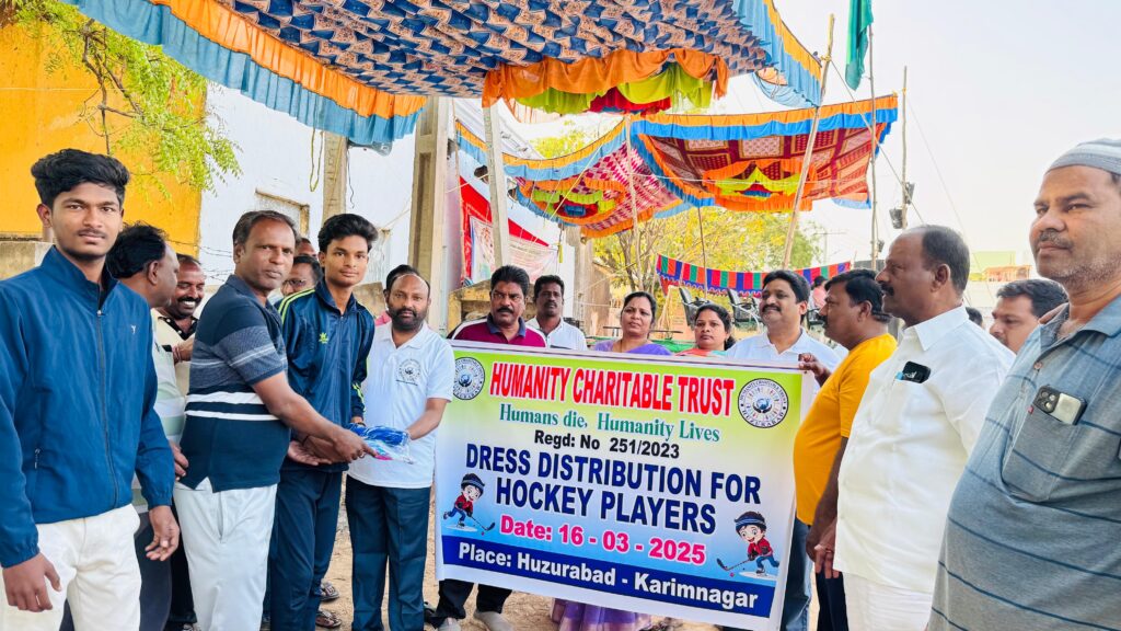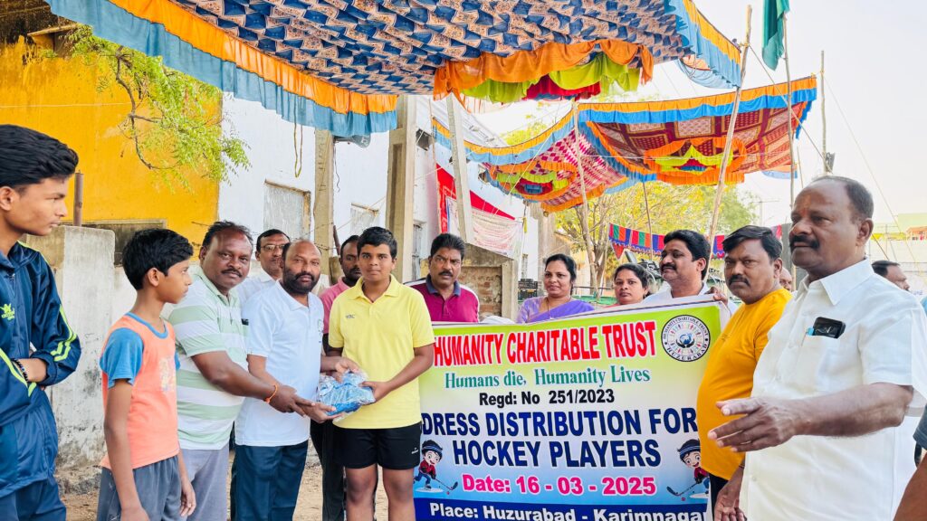 హ్యుమానిటీ చారిటబుల్ ట్రస్ట్ ఆధ్వర్యంలో ఆదివారం రోజున హుజూరాబాద్ లో నిర్వహించూచున్న హాకీ పోటీలను దృష్టిలో ఉంచుకుని హుజూరాబాద్ పట్టణ హాకీ ప్లేయర్లకు హ్యుమానిటీ చారిటబుల్ ట్రస్టు ఆధ్వర్యంలో 35 మందికి డ్రెస్ లు పంపిణీ చేయటం జరిగింది. ఈ కార్యక్రమంలో భాగంగా ట్రస్ట్ చైర్మన్ నవీన్ కుమార్ మాట్లాడుతూ రాష్ట్ర స్థాయి పోటీలు హుజూరాబాద్ లో జరగడం సంతోషంగా ఉందన్నారు. హుజూరాబాద్ క్రీడాకారులు రానున్న కాలంలో జాతీయ స్థాయిలో తమ సత్తా చాటాలని ఆకాంక్షించారు. ఈ కార్యక్రమానికి ట్రస్ట్ సభ్యులు కవిత నవీన్ కుమార్, బాపయ్య, సరళ, సతీష్, నరేష్, గోపి, నాయకులు బండ శ్రీనివాస్, తోట రాజేంద్ర ప్రసాద్, తాళ్లపెల్లి శ్రీనివాస్, గోవర్దన్, రమేష్ తదితరులు పాల్గొన్నారు.
