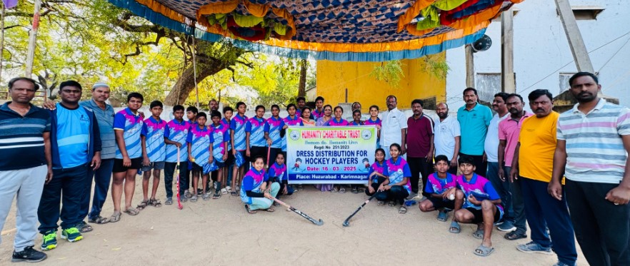 హ్యుమానిటీ చారిటబుల్ ట్రస్ట్ ఆధ్వర్యంలో ఆదివారం రోజున హుజూరాబాద్ లో నిర్వహించూచున్న హాకీ పోటీలను దృష్టిలో ఉంచుకుని హుజూరాబాద్ పట్టణ హాకీ ప్లేయర్లకు హ్యుమానిటీ చారిటబుల్ ట్రస్టు ఆధ్వర్యంలో 35 మందికి డ్రెస్ లు పంపిణీ చేయటం జరిగింది. ఈ కార్యక్రమంలో భాగంగా ట్రస్ట్ చైర్మన్ నవీన్ కుమార్ మాట్లాడుతూ రాష్ట్ర స్థాయి పోటీలు హుజూరాబాద్ లో జరగడం సంతోషంగా ఉందన్నారు. హుజూరాబాద్ క్రీడాకారులు రానున్న కాలంలో జాతీయ స్థాయిలో తమ సత్తా చాటాలని ఆకాంక్షించారు. ఈ కార్యక్రమానికి ట్రస్ట్ సభ్యులు కవిత నవీన్ కుమార్, బాపయ్య, సరళ, సతీష్, నరేష్, గోపి, నాయకులు బండ శ్రీనివాస్, తోట రాజేంద్ర ప్రసాద్, తాళ్లపెల్లి శ్రీనివాస్, గోవర్దన్, రమేష్ తదితరులు పాల్గొన్నారు.