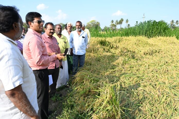 రేణిగుంట మండలం, గాజులమండ్యం గ్రామ పొలాల్లో ఈ క్రాప్ లో గ్రామ వ్యవసాయ సహాయకులు నమోదు చేసిన పంటలను సూపర్ చెక్ తనిఖీ చేసి రైతులతో మాట్లాడుతూ ప్రతి ఒక్క రైతు తాము సాగు చేస్తున్న పంటలను వ్యవసాయ అధికారుల సహకారంతో పంట నమోదు (ఈ క్రాప్) చేయించుకోవాలని జిల్లా కలెక్టర్ డాక్టర్ వెంకటేశ్వర్ ఎస్ పేర్కొన్నారు. శనివారం సాయంత్రం జిల్లా కలెక్టర్ రేణిగుంట మండలం, గాజులమండ్యం గ్రామ పొలాల్లో ఈ- క్రాప్ లో గ్రామ వ్యవసాయ సహాయకులు నమోదు చేసిన పంటలను సూపర్ చెక్ తనిఖీ చేసారు. ప్రతి ఒక్క రైతు తాము సాగు చేస్తున్న పంటలను వ్యవసాయ అధికారుల సహకారంతో పంట నమోదు (ఈ క్రాప్) చేయించుకోవాలని జిల్లా కలెక్టర్ సూచించారు. ప్రకృతి వైపరీత్యాల వల్ల పంట నష్టం జరిగితే రైతుకు పరిహారం అందించేందుకు తప్పనిసరిగా ఈక్రాప్ నమోదులో రైతులు తమ పేర్లు నమోదు చేయించుకోవాలని కలెక్టర్ రైతులకు అవగాహన కలిగించారు. తమకు ఆర్.యస్.కె అధికారులు ఎప్పటికప్పుడు కలిసి సాగులో సూచనలు అందిస్తున్నారని రైతులు కలెక్టర్ కు తెలిపారు. ప్రకృతి వ్యవసాయం ద్వారా వరి పండించిన రైతు ధనంజయ రెడ్డి పొలాన్ని సందర్శించి, ఇదే విధంగా గ్రామం లోని మిగిలిన రైతులు కూడా ప్రకృతి వ్యవసాయం ద్వారా పంటలు పండించి వినియోగించడం వలన ఆరోగ్య సమస్యలు తగ్గుతాయని సూచించారు. వరి పంటకు తగిన మద్దతు ధర అమలు అయ్యే విధంగా తగిన చర్యలు తీసుకుంటున్నామని జిల్లా కలెక్టర్ రైతులకు భరోసా ఇచ్చారు. కలెక్టర్ పర్యటనలో జిల్లా వ్యవసాయ అధికారి ప్రసాదరావు , మండల వ్యవసాయ అధికారి సునీల్ కుమర్ రెడ్డి, గ్రామ రెవెన్యూ అధికారి ,గ్రామ వ్యవసాయ సహాయకులు, రైతులు తదితరులు ఉన్నారు.
