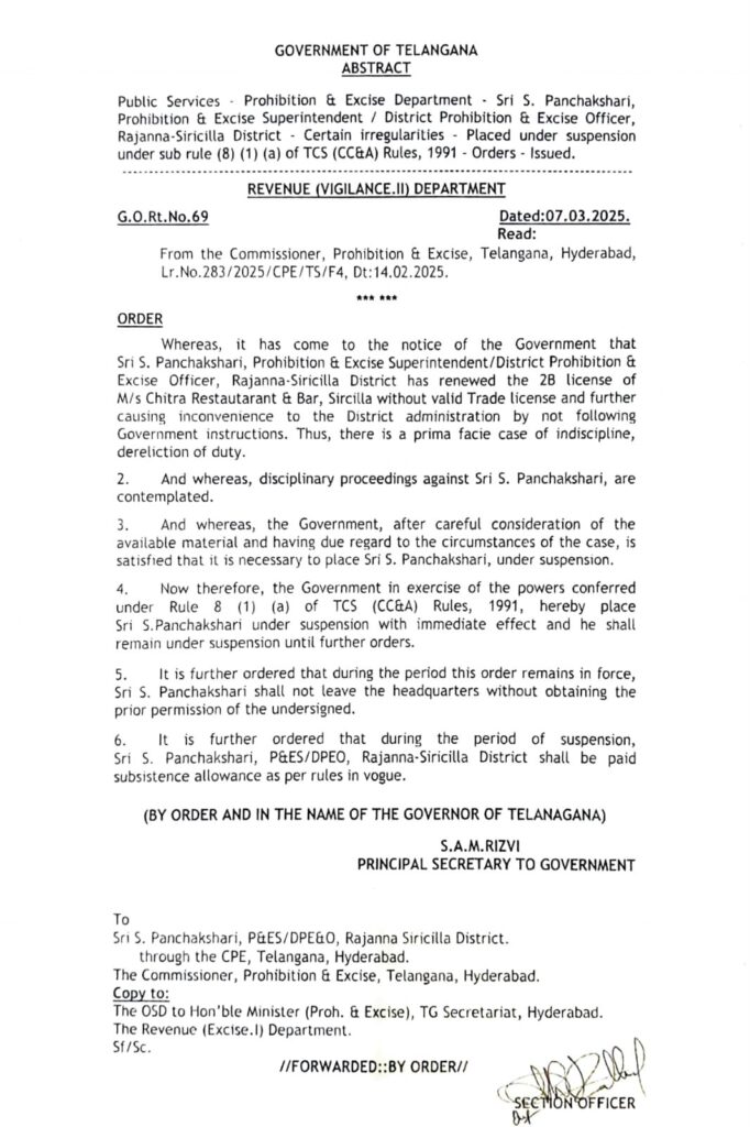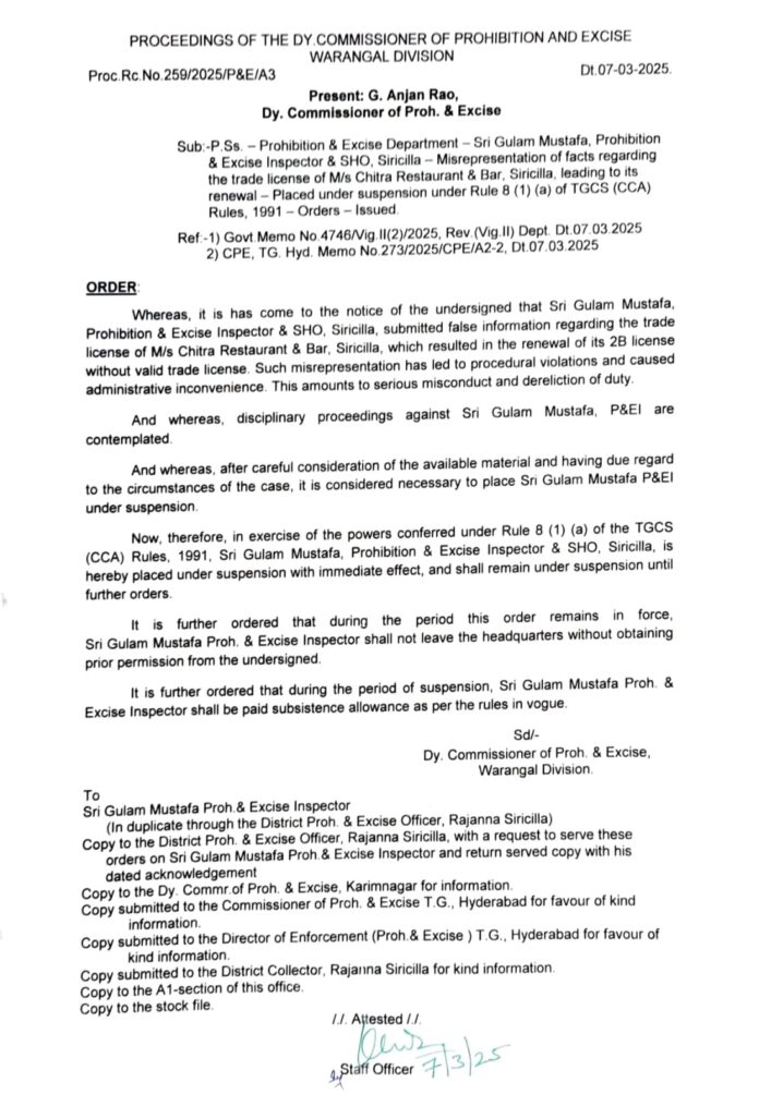 నేటి సాక్షి ప్రతినిధి, రాజన్న సిరిసిల్ల ( కోక్కుల వంశీ ) : రాజన్న సిరిసిల్ల జిల్లాలో చిత్ర రెస్టారెంట్ అండ్ బార్ సంబంధించి ప్రభుత్వ ఆదేశాలు మరియు నియమ నిబంధనలు పాటించకుండా ట్రేడ్ లైసెన్స్ లేకుండానే 2 బి లైసెన్స్ రెన్యువల్ చేసి, క్రమశిక్షణ రాహిత్యంగా వ్యవహరిస్తూ జిల్లా యంత్రాంగానికి ఇబ్బందులు గురి చేసినందుకు గాను సిరిసిల్ల జిల్లా అబ్కారీ శాఖ అధికారి ఎస్. పంచాక్షరి, తప్పుడు వివరాలు నివేదికలను సమర్పించినందుకు గాను ఎక్సైజ్ ఇన్స్పెక్టర్ గులాం ముస్తఫా లను సస్పెండ్ చేస్తూ ప్రభుత్వం ఉత్తర్వులు జారీ చేసింది.