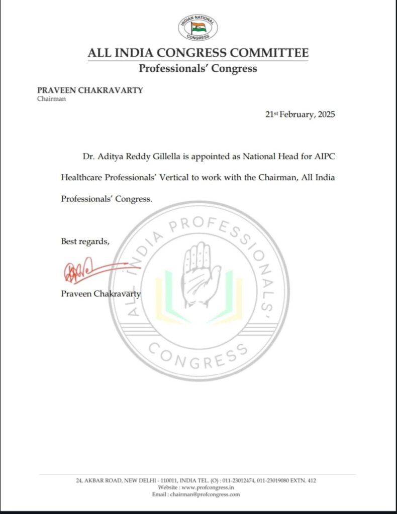 నేటి సాక్షి, ప్రతినిధి వనపర్తి జిల్లా : ఆల్ ఇండియా కాంగ్రెస్ కమిటీ అనుబంధ సంస్థ ఆల్ ఇండియా ప్రొఫెషనల్ కాంగ్రెస్ ( ఏఐపిసి ) హెల్త్ కేర్ ప్రొఫెషనల్స్ నేషనల్ హెడ్ గా డాక్టర్ జిల్లెల ఆదిత్య రెడ్డి నియమితులయ్యారు.ఈ మేరకు ఆలిండియా ప్రొఫెషనల్ కాంగ్రెస్ జాతీయ అధ్యక్షులు ప్రవీణ్ చక్రవర్తి శుక్రవారం నియామక పత్రాన్ని ఆదిత్య రెడ్డి కి అందజేశారు.వనపర్తి జిల్లా గోపాల్ పేట మండలం జయన్న తిరుమలాపూర్ గ్రామానికి చెందిన డాక్టర్ జిల్లెలఆదిత్య రెడ్డి ప్రస్తుతం ప్రొఫెషనల్ కాంగ్రెస్ రాష్ట్ర కోఆర్డినేటర్ గా బాధ్యతలు నిర్వహిస్తున్నారు.తెలంగాణ రాష్ట్ర ప్రణాళికా సంఘం వైస్ చైర్మన్ డాక్టర్ జిల్లెల చిన్నారెడ్డి పెద్ద కుమారుడు ఆదిత్య రెడ్డి ఆల్ ఇండియా ప్రొఫెషనల్ కాంగ్రెస్ హెల్త్ కేర్ నేషనల్ హెడ్ గా నియమితులు కావడం పట్ల సర్వత్రా హర్షం వ్యక్తం అవుతుంది.ఏఐపిసి హెల్త్ కేర్ ప్రొఫెషనల్స్ డాక్టర్ ఆదిత్య రెడ్డి దేశంలోని 28 రాష్ట్రాల్లో విస్తృతంగా ప్రొఫెషనల్ కాంగ్రెస్ కృషి చేయాలని జాతీయ చైర్మన్ ప్రవీణ్ చక్రవర్తి సూచించారు.దేశంలోని అన్ని రాష్ట్రాల్లో ఏఐపిసి కాంగ్రెస్ పార్టీ బలోపేతానికి కృషి చేస్తానని, హెల్త్ కేర్ ప్రొఫెషనల్స్ ను సమీకరిస్తానని డాక్టర్ జిల్లెల ఆదిత్య రెడ్డి పేర్కొన్నారు.తన నియామకానికి కృషి చేసిన ఎఐసిసి అధ్యక్షుడు మల్లికార్జున్ ఖర్గే కి,ఎఐసిసి లోక్ సభ ప్రధాన ప్రతిపక్ష నాయకులు రాహుల్ గాంధీ కి, ఆధినాయకురాలు సోనియా గాంధీ కి , ఎంపీ ప్రియాంక గాంధీ కి, ఏఐపిసి చైర్మన్ ప్రవీణ్ చక్రవర్తి కి డాక్టర్ జిల్లెల ఆదిత్య రెడ్డి ధన్యవాదాలు తెలిపారు.