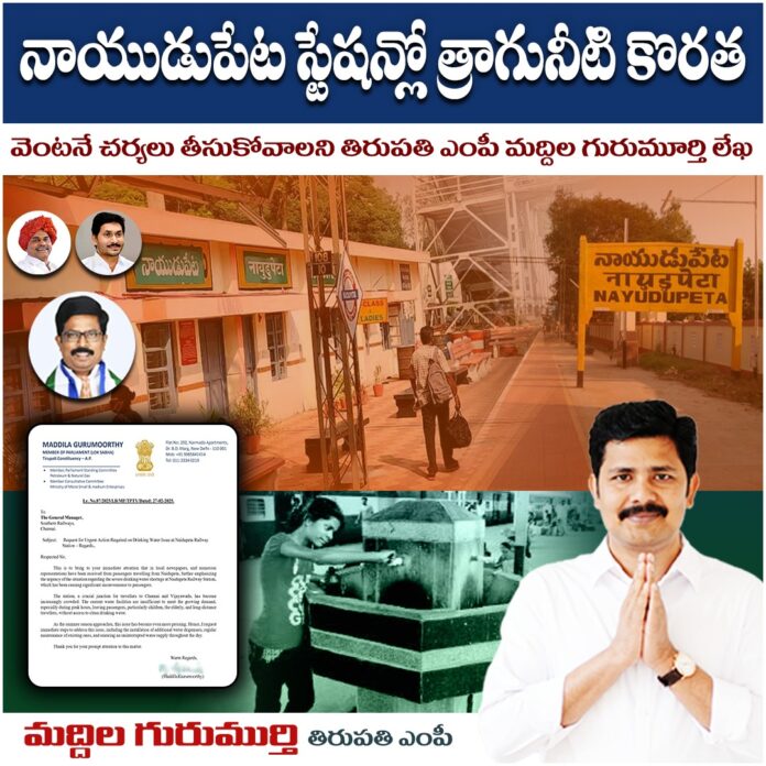 నేటి సాక్షి తిరుపతి న్యూస్, తిరుపతి ప్రతినిధి (డాక్టర్ శివ): నాయుడుపేట రైల్వే స్టేషన్లో త్రాగునీటి కొరత సమస్య తీవ్రంగా ఉందని ప్రయాణికుల నుండి అందిన విజ్ఞప్తులు, వార్తా కథనాల ద్వారా తెలుసుకున్న తిరుపతి పార్లమెంట్ సభ్యులు మద్దిల గురుమూర్తి దక్షిణ రైల్వే జనరల్ మేనేజర్కు లేఖ రాశారు. చెన్నై, విజయవాడ, హైదరాబాద్ వంటి ప్రధాన పట్టణాలకు నాయుడుపేట రైల్వే స్టేషన్ ద్వారా సమీప గ్రామాల ప్రజలు నిత్యం ప్రయాణిస్తున్నారని తెలిపారు. రోజురోజుకూ ప్రయాణికుల సంఖ్య పెరుగుతున్న నేపథ్యంలో త్రాగునీటి సౌకర్యాలు లేకపోవడం వల్ల ప్రయాణికులు, ముఖ్యంగా చిన్న పిల్లలు, వృద్ధులు, మహిళలు తీవ్ర అసౌకర్యాన్ని ఎదుర్కొంటున్నారని ఎంపీ పేర్కొన్నారు. వేసవి కాలం సమీపిస్తున్న నేపథ్యంలో ఈ సమస్య మరింత తీవ్రమయ్యే అవకాశం ఉందని, తక్షణమే తగిన చర్యలు తీసుకుని త్రాగునీటి కొరత నివారించాల్సిందిగా ఎంపీ మద్దిల గురుమూర్తి విజ్ఞప్తి చేశారు. అదనపు వాటర్ డిస్పెన్సర్లు ఏర్పాటు చేయడంతో పాటు, ఇప్పటికే ఉన్న వాటిని సక్రమంగా నిర్వహించి, నిరంతర త్రాగునీటి సరఫరా అందుబాటులో ఉండేలా చూడాలని కోరారు. ప్రయాణికుల సంక్షేమాన్ని దృష్టిలో ఉంచుకొని వెంటనే ఈ సమస్యను పరిష్కరించాలని లేఖ ద్వారా కోరారు.