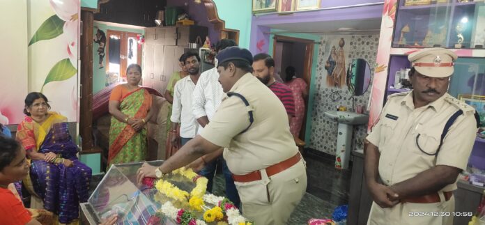 నేటి సాక్షి. మెదక్. (భూమయ్య) : ఈ రోజు మెదక్ జిల్లా ఎస్.పి. డి. ఉదయ్ కుమార్ రెడ్డి ఐ.పి.ఎస్. గారి ఆదేశానుసారం జిల్లా అదనపు ఎస్.పి. అడ్మిన్ ఎస్.మహేందర్ గారు కుల్చారం పోలీస్ స్టేషన్ పరిధి లో ఆత్మహత్య చేసుకున్న హెడ్ కానిస్టేబుల్ సాయి కుమార్ మృతధేహానికి పూలమాల వేసి నివాళు అరిపించారు. సాయి కుమార్ కుటుంబానికి పరామర్శించి అన్నీ విధాలుగా అండగా ఉంటామని భరోసానిచ్చారు.సాయి కుమార్ మరణ వార్త పోలీస్ యంత్రాంగాన్ని కలచివేసిందని, ప్రగడ సంతాపాన్ని ప్రకటించారు. ఈ కార్యక్రమంలో మెదక్ డిఎస్పి ప్రసన్న కుమార్ మరియు రూరల్ సిఐ శ్రీ. రాజశేఖర్ రెడ్డి మరియు నర్సాపూర్ ఎస్ఐ లింగం, కుల్చారం ఎస్ఐ. గౌస్ పాల్గొన్నారు.
