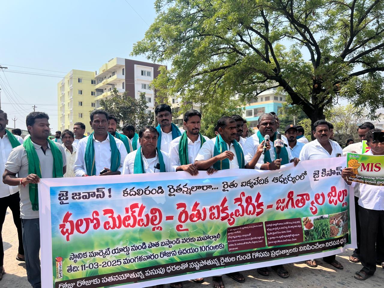నేటి సాక్షి, మెట్ పల్లి రూరల్ : ఆరుగలం శ్రమించిన పసుపు పంటకు మద్దతూ ధర కావాలంటూ రైతులు మంగళవారం మెట్ పల్లి పాత బస్ స్టాండ్ వద్ద బైటాయించి నిరసనకు దిగారు.పచ్చ బంగారంలా బావించే పసుపు ధర రోజురోజుకి దిగజారుతూ పండించే రైతులకు పెట్టుబడులు రానటువంటి పరిస్థితుల్లో ఎన్నో ఏండ్లుగా పసుపు బోర్డ్, మద్దతు ధర కోసం పోరాటం చేస్తున్న రైతులు పసుపు బోర్డ్ సాధించుకున్న బహిరంగ మార్కెట్ లో దిగజారుతున్న ధరలతో దిగాలుగా ఉన్న రైతు మరోసారి రోడ్డెక్కి నిరసన తెలిపినటువంటి పరిస్థితినెలకొంది. పసుపుకి పదిహేను వేల మద్దతు ధర కలిపించాలని కోరుతూ కేంద్ర, రాష్ట్ర ప్రభుత్వాలు సమన్వయంతో దిగివచ్చి రైతులను ఆదుకోవాలని రైతు ఐక్య వేదిక ఆధ్వర్యంలో మెట్ పెల్లి మార్కెట్ యార్డ్ నుండి వేలాది మంది రైతులు ర్యాలీ గా పాత బస్టాండ్ చౌరస్తా చేరుకొని నిరసన తెలపడం జరిగింది. ఈసందర్భంగా పసుపు రైతుల కోసం పోరాటం చేసిన కీశే ముత్యాల మనోహర్ రెడ్డి మరణించగా వారి ఆత్మకు శాంతి చేకూరాలని ఒక నిమిషం మౌనం పాటించారు. అనంతరం రైతు నాయకులు మాట్లాడుతూ రైతుల పేరు చెప్పుకుని ఓట్లు వేయించుకొని ప్రభుత్వాల గద్దెనెక్కి మావి రైతుల ప్రభుత్వాలు అని చెప్పుకుంటూ రైతులు పండించే పంటలకు మద్దతు ధరలు దక్కనప్పుడు మొకం చాటిస్తున్నారని అన్నారు. ప్రస్తుతం పసుపుకు మద్దతు ధర సంగతి దేవుడెరుగు, మార్కెట్ లో పసుపు కొనడానికి వ్యాపారులు ముందుకు రాక నిజమాబాద్ వంటి మార్కెట్ లలో రైతులు రోడ్డెక్కిన పరిస్థితి ఉంది. ఇలాంటి పరిస్థితుల్లో పసుపు రైతులని ఆదుకోవడానికి కేంద్ర ప్రభుత్వం పసుపు పంటను మద్దతు ధరల పంటల జాబితా లో చేర్చి, పసుపుకి సైతం పదిహేను వేలు మద్దతు ధర ప్రకటించడం లేదా మద్దతు ధర లేని దృష్ట్యా కేంద్ర ప్రభుత్వం మార్కెట్ ఇంటర్వేన్షన్ పథకం కింద రాష్ట్ర ప్రభుత్వం కొనుగోలుకు అనుమతి ఇచ్చి, రాష్ట్ర ప్రభుత్వం మార్క్ ఫెడ్ ఆధ్వర్యంలో కొనుగోలు కేంద్రాలు ఏర్పాటు చేసి పసుపు పంట కొనుగోలు చేసి రైతులను ఆదుకోవాలని పేర్కొన్నారు. ఈ కార్యక్రమం లో రైతు ఐక్య వేదిక రాష్ట్ర నాయకులు పన్నాల తిరుపతి రెడ్డి, రైతు ఐక్య వేదిక జిల్లా అధ్యక్షులు నల్ల రమేష్ రెడ్డి, ఉపాధ్యక్షులు మిట్టపల్లి తిరుపతి రెడ్డి,కర్నె రాజేందర్,రైతు సంఘాల నాయకులు మారు మురళీధర్ రెడ్డి,బందెల మల్లన్న, కొట్టాల మోహన్ రెడ్డి, వేముల కర్ణాకర్ రెడ్డి,చెరుకు ఉత్పత్తి దారుల సంఘం అధ్యక్షులు మామిడి నారాయణ రెడ్డి, ఎలిషా పాపన్న,రైతు సంఘాల పెద్దలు, అధిక సంఖ్యలో రైతులు పాల్గొన్నారు.