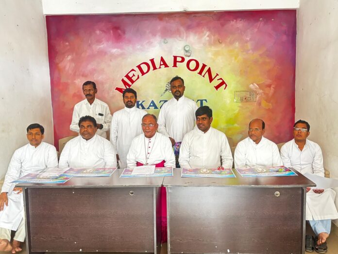 నేటి సాక్షి ఉమ్మడి వరంగల్ జిల్లా స్టాఫ్ రిపోర్టర్ (సందెల రాజు) : హన్మకొండ జిల్లా కాజీపేట మండల కేంద్రంలో ఫాతిమా మాత తిరునాళ్ళ మహోత్సవాలు వరంగల్ పీఠాధిపతులు మహా ఘన డా..ఉడుముల బాల ఆధ్వర్యంలో ఘనంగా నిర్వహంచనున్నారు. సోమవారం కాజీపేట మీడియా పాయింట్ లో ఏర్పాటు చేసిన మీడియా సమావేశంలో ఉడుముల బాల మాట్లాడుతూ…12 జిల్లాల విశ్వాసుల తిరునాళ్ళ మహోత్సవం నేటి నుంచి 11,12,13 వ తేదీలలో జరుగనున్న వేడుకలకు భక్తులు వేల సంఖ్యలో పాల్గొంటారని తెలిపారు. మూడు రోజుల పాటు జరిగే ఈ వేడుకల్లో దంపతుల ఆశీర్వచనాలు, దివ్య పూజాబలి, మహా రథం ప్రదక్షణ, ఫాతిమా ప్రధాన తోరణం ప్రారంభోత్సవం, పలు పూజ కార్యక్రమాలు చేపట్టనున్నట్లు తెలిపారు. అనంతరం ఉత్సవాలకు సంబంధించిన పోస్టర్ ను ఆవిష్కరణ చేశారు. ఈ కార్యక్రమంలో ఫాతిమా నగర్ విచారణ గురువులు ఫా.. కాసు మర్రెడ్డి, పాస్టరల్ సెంటర్ డైరెక్టర్ ఫా..తాటికొండ జోసఫ్, ఏకశిలా నగర్ విచారణ గురువులు ఫా..పొలిమేర సురేష్ వడ్డేపల్లి విచారణ గురువులు ఫా.. గంగారపు నవీన్, ఫా.. అనుకిరణ్ తదితరులు పాల్గొన్నారు.