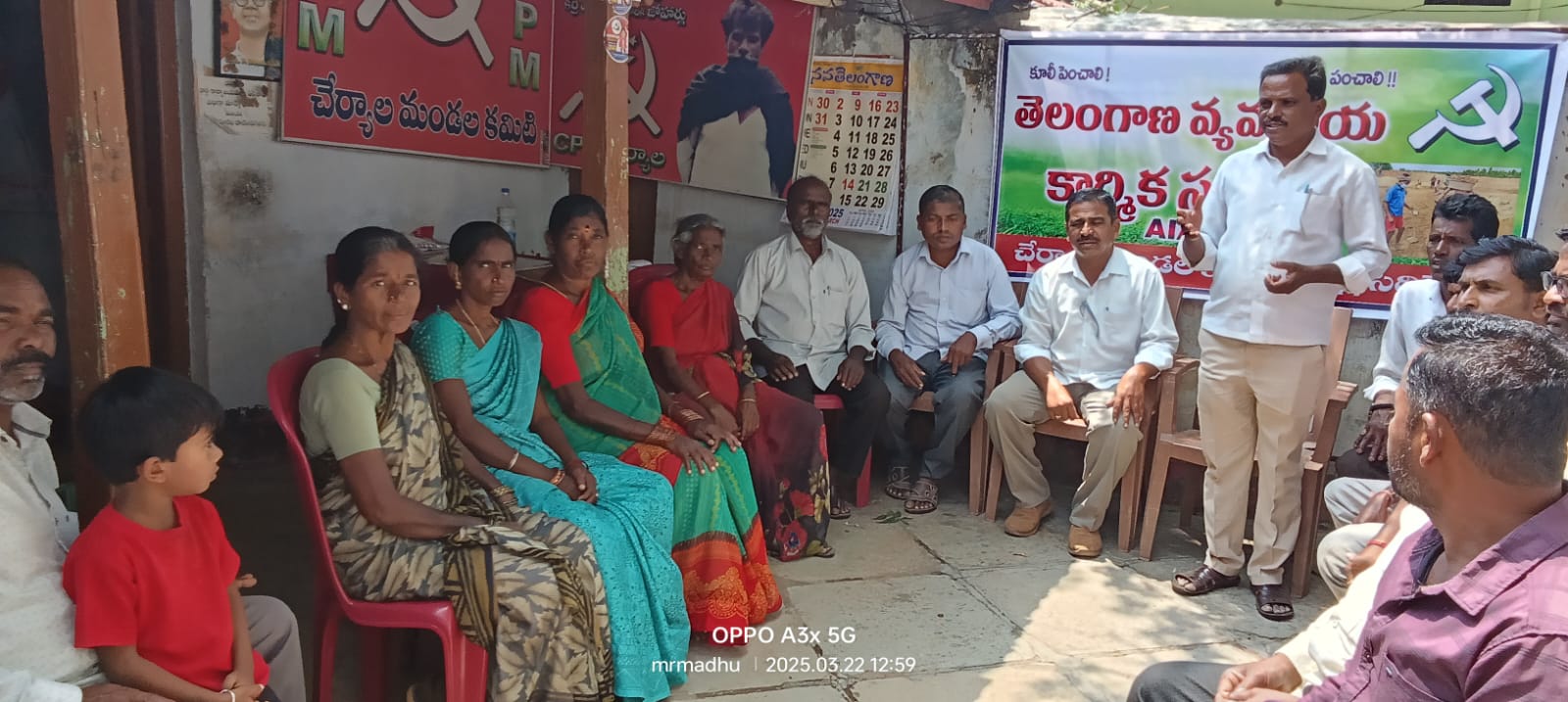 నేటిసాక్షి చేర్యాల : ఉపాధి హామీ కూలీల, గ్రామీణ పేదల సమస్యల పరిష్కారం కోసం పోరాటాలకు సిద్ధం కావాలని తెలంగాణ వ్యవసాయ కార్మిక సంఘం జిల్లా కార్యదర్శి రాళ్ల బండి శశిధర్ పిలుపునిచ్చారు. శనివారం రోజున చేర్యాల స్థానిక కార్యాలయంలో గుండ్ర రవీందర్ అధ్యక్షతన తెలంగాణ వ్యవసాయ కార్మిక సంఘం చేర్యాల మండల, పట్టణ కమిటీల సమావేశం జరిగింది. ఈ సమావేశంలో ముఖ్యఅతిథిగా రాళ్ల బండి శశిధర్ మాట్లాడుతూ నేడు కేంద్ర రాష్ట్ర ప్రభుత్వాలు ఏకమై ఉపాధి హామీ పథకాన్ని నిర్వీర్యం చేస్తున్నాయని దీనితో కూలీలు, గ్రామీణ పేదలు తీవ్ర ఇబ్బందులకు గురవుతున్నారని ఉపాధి హామీ పథకంలో పనిచేసిన కూలీలకు రెండు నెలలైనా కూలీ డబ్బులు రావడంలేదని, పొద్దంతా పనిచేసిన ఫలితం లేకుండా అధికారులు వ్య వరిస్తున్నారని ఎండాకాలంలో సమ్మర్ అలవెన్స్ ను, పలుగు, పారా, తట్ట లాంటి పనిముట్లకు వాడకం చార్జీని ఇవ్వడం లేదని క్రమక్రమంగా ఒక్కొక్క దానిని తగ్గించి కూలీలకు ఫలితం లేకుండా చేస్తున్నారని ఈ చర్యలను మానుకొని పెరుగుతున్న ధరల కనుగుణంగా రోజు కూలి 800 రూపాయలు, కుటుంబానికి 200 రోజుల పని దినాలను కల్పించాలని, పే స్లిప్పులు ఇవ్వాలని, ఫోటో క్యాప్చరింగ్ విధానం తీసివేయాలని, అర్హులైన పేదలందరికీ ఇండ్ల స్థలాలు ఇందిరమ్మ ఇండ్ల నిర్మాణానికి కేంద్ర ప్రభుత్వం 10 లక్షల రూపాయలు, రాష్ట్ర ప్రభుత్వం ఐదు లక్షల రూపాయలు మంజూరు చేయాలని, రేషన్ కార్డులు, భూమిలేని నిరుపేద ఉపాధి జాబు కార్డు గల కుటుంబాలకు ఆత్మీయ భరోసా కుటుంబానికి 12,000 రూపాయలు, పెన్షన్లు మంజూరు చేయాలని రాష్ట్ర ప్రభుత్వం ఎన్నికల సందర్భంగా పేదలకు ఇచ్చిన హామీలను అన్నింటినీ నెరవేర్చాలని డిమాండ్ చేశారు. గత ప్రభుత్వాలు ఎన్నో ఏళ్ల నుండి పేదలకు అనేక హామీలు ఇచ్చి కాలయాపన చేస్తూ మోసపుచ్చుతున్నారని ఈ హామీలు హామీలుగానే మిగిలిపోతున్నాయని హామీలు నెరవేరాలంటే ప్రజలకు అందాలంటే అర్హులైన నిరుపేదలందరూ ఏకమై పోరాటాలకు సిద్ధం కావాలని అప్పుడే హామీల అమలుకు పరిష్కారం దొరుకుతుందని ఏండ్ల నుండి నిరీక్షణ చెందుతున్న పేద ప్రజలు తెలంగాణ వ్యవసాయ కార్మిక పోరాటాల్లో కలిసి రావాలని పిలుపునిచ్చారు. ఈ కార్యక్రమంలో తెలంగాణ వ్యవసాయ కార్మిక సంఘం జిల్లా అధ్యక్షులు కొంగరి వెంకట మావో మండల కార్యదర్శి గొర్రె శ్రీనివాస్, పట్టణ కార్యదర్శి బోయిని మల్లేశం, మల్కనీ ఎల్లయ్య, మరియాల సత్తయ్య, జీడాల చంద్రయ్య,గర్నపల్లి చంద్రం, పో న మైన సిద్ధులు, గొలుసుల సురేష్,తాడూరి నర్సింలు, భీమ శ్రీను, పండుగ బాలమని, దోనికల కనకవ్వ, నూర్ బి, కర్రోళ్ల కనుక లక్ష్మి, తదితరులు పాల్గొన్నారు.