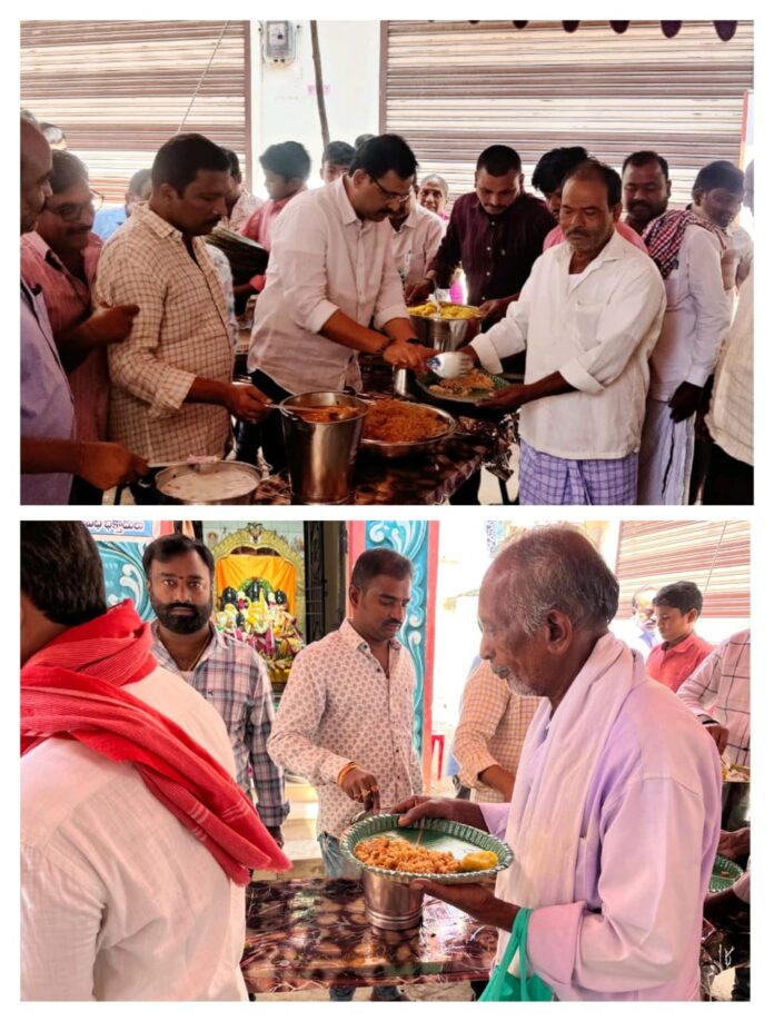 నేటిసాక్షి రామాపురం మండలం ప్రతినిధి భక్త కుమార్ : శ్రీ వీరభద్ర స్వామి బ్రహ్మోత్సవాల సందర్బంగా ఆదివారం రోజు రాయచోటి పట్టణం త్యాగరాజు వీధి రామాలయం నందు ఏర్పాటుచేసిన 17వ వార్షికోత్సవ అన్నదానం కార్యక్రమానికి త్యాగరాజు వీధి బక్తాదులు ఆహ్వానం మేరకు రాష్ట్ర టిడిపి కార్యనిర్వాహక కార్యదర్శి టీటీడీ పాలకమండలి మాజీ సభ్యులు రాయచోటి నియోజకవర్గం టిడిపి సీనియర్ నాయకులు శ్రీ సుగవాసి ప్రసాద్ బాబు గారు విచ్చేసిన సందర్బంగా ఘనస్వాగతం పలికి రామాలయంలో పూజలు చేసి అన్నదానం కార్యక్రమాన్ని ప్రారంభించారు. ఈ సందర్బంగా ప్రసాద్ బాబు మాట్లాడుతూ శ్రీ వీరభద్ర స్వామి బ్రహ్మోత్సవాలలో భాగంగా జరిగే తిరుణాళ్లకు వివిధ ప్రాంతాలనుండి మరియు కర్ణాటక నుండి విరివిగా వచ్చే భక్తులకు అన్నంకోసం ఇబ్బందులు పడకూడదని త్యాగరాజు వీధి వారు “అన్నం పరబ్రహ్మ స్వరూపం అన్ని దానాలకన్న అన్నదానం గొప్పది” అని అన్నదాన సౌకర్యం కల్పించడం చాలా సంతోషంగా ఉందని ప్రసాద్ బాబు గారు తెలియజేసి వారిని అభినందించారు.