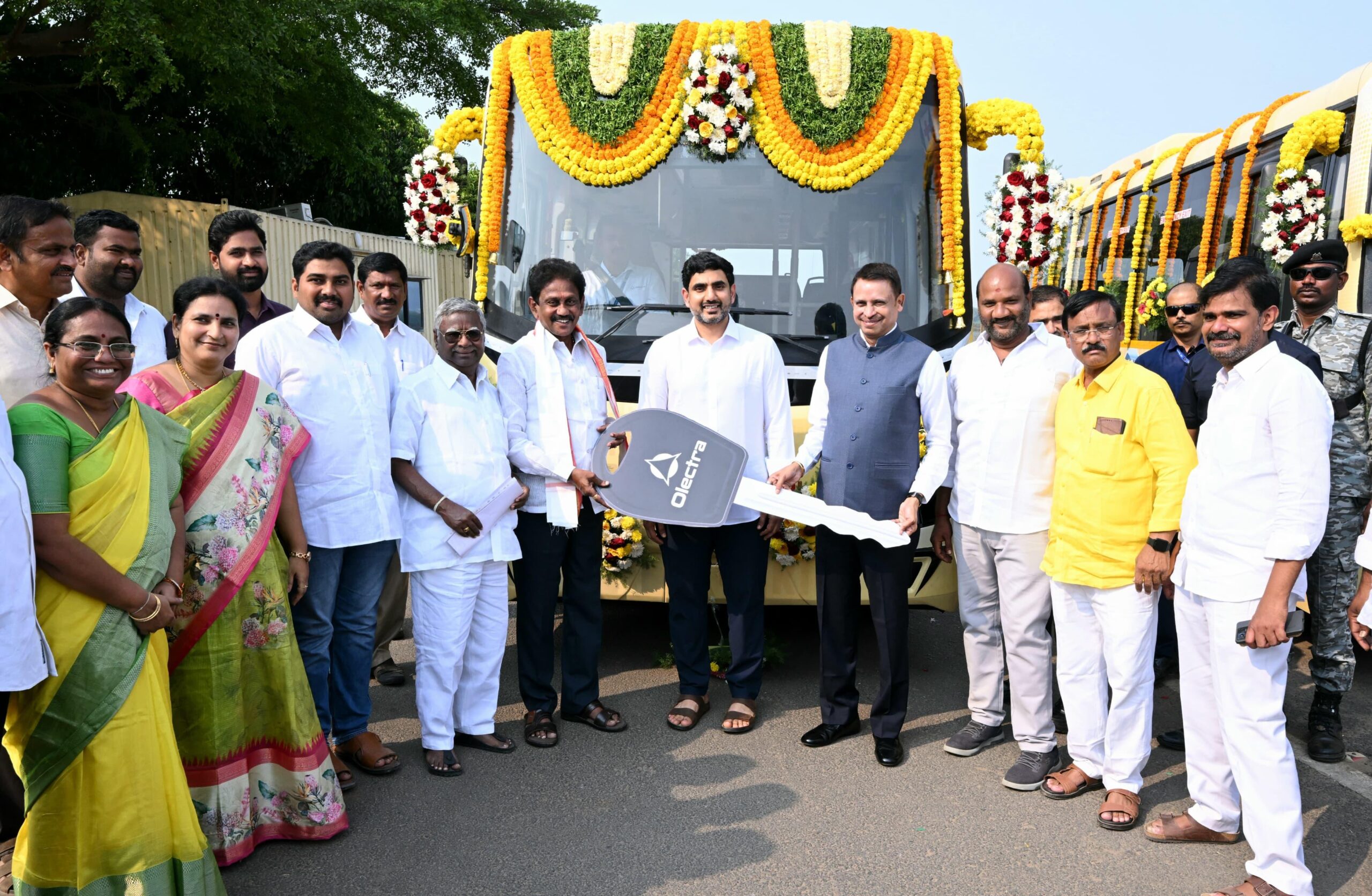 నేటి సాక్షి తిరుపతి జిల్లా (బాదూరు బాల) అమరావతి: మంగళగిరి నియోజకవర్గ పరిధిలో ఉచిత ఎలక్ట్రికల్ బస్సు సేవలను రాష్ట్ర విద్య, ఐటి, ఎలక్ట్రానిక్స్ శాఖల మంత్రి నారా లోకేష్ ఉండవల్లి నివాసంలో సోమవారం జెండా ఊపి ప్రారంభించారు. సుదూర ప్రాంతాల నుంచి ఎయిమ్స్ హాస్పటల్, పానకాల లక్ష్మీనరసింహస్వామి ఆలయానికి వచ్చే ప్రజలు రాకపోకలకు ఇబ్బంది పడుతున్న విషయం మంత్రి లోకేష్ దృష్టికి వచ్చింది. సిఎస్ఆర్ నిధుల నుంచి బస్సులను సమకూర్చాల్సిందిగా మెగా ఇంజనీరింగ్ & ఇన్ ఫ్రాస్ట్రక్చర్ (MEIL)ను మంత్రి లోకేష్ అభ్యర్థించారు. లోకేష్ విజ్ఞప్తిపై సానుకూలంగా స్పందించిన MEIL ఫౌండేషన్ రూ.2.4కోట్ల విలువైన రెండు అత్యాధునిక Olectra 7 మీటర్ల ఎలక్ట్రిక్ బస్సులను అందజేసింది. ఈ బస్సుల్లో ఒకటి మంగళగిరి బస్టాండు నుంచి ఎన్ఆర్ఐ జంక్షన్, డిజిపి ఆఫీసు మీదుగా ఎయిమ్స్ కు నడుస్తుంది. మరొకటి మంగళగిరి బస్టాండు నుంచి ఎన్ఆర్ఐ జంక్షన్ మీదుగా పానకాలస్వామి గుడివరకు నడుస్తుంది. ఎయిమ్స్ కు వెళ్లే బస్సు ఉదయం 6గంటల నుంచి సాయంత్రం 6గంటల వరకు, పానకాలస్వామి ఆలయానికి వెళ్లే బస్సు ఉదయం 7నుంచి రాత్రి 8గంటల వరకు ప్రయాణీకులకు ఉచితంగా సేవలందిస్తుంది. . ప్రతి బస్సు 18 మంది ప్రయాణికుల సామర్థ్యంతో ఒక ఛార్జీతో 150 కి.మీ. వరకు నడపగలదు. ఈ బస్సులు డిజిటల్ ఇన్స్ట్రుమెంట్ ప్యానెళ్లు, ఎలక్ట్రానిక్ హైడ్రాలిక్ పవర్ స్టీరింగ్ (EHPS), రియల్-టైమ్ వెహికల్ ట్రాకింగ్ సిస్టమ్స్ (VTS), రివర్స్ పార్క్ అసిస్ట్ సిస్టమ్స్ (RPAS) వంటి అత్యాధునిక సౌకర్యాలతో భద్రతాప్రమాణాలు కలిగి ఉంటాయి. ఈ కార్యక్రమంలో ఒలెక్ట్రా గ్రీన్టెక్ లిమిటెడ్ ఛైర్మన్ & మేనేజింగ్ డైరెక్టర్ K.V. ప్రదీప్, ఎయిమ్స్ డైరక్టర్ శాంతా సింగ్, డిప్యూటీ డైరక్టర్ శశికాంత్, లక్ష్మీనరసింహస్వామి ఆలయ కార్యనిర్వహణాధికారి ఎ. కోటిరెడ్డి, టిటిడి బోర్డు మెంబర్ తమ్మిశెట్టి జానకీదేవి, పద్మశాలి కార్పొరేషన్ చైర్మన్ నందం అబద్దయ్య, దుగ్గిరాల మండల పార్టీ అధ్యక్షురాలు కేశంనేని శ్రీఅనిత, తాడేపల్లి మండల పార్టీ అధ్యక్షుడు అమరా సుబ్బరావు, తాడేపల్లి పట్టణ పార్టీ అధ్యక్షుడు వల్లభనేని వెంకట్రావు, టిడిపి నాయకులు గోవాడ దుర్గారావు, కొల్లి శేషు, షేక్ రియాజ్, తాళ్ల అశోక్ కుమార్ యాదవ్ తదితరులు పాల్గొన్నారు.