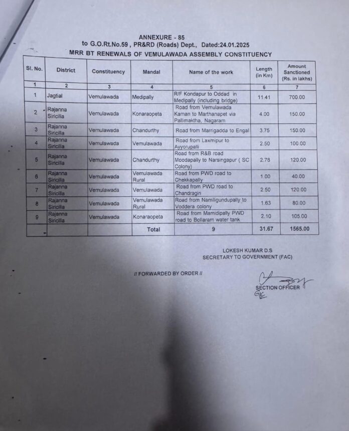 నేటి సాక్షి ప్రతినిధి, చందుర్తి (సతీష్) : పలు అభివృద్ధి పనులుకు తెలంగాణ రాష్ట్ర ముఖ్యమంత్రి రేవంత్ రెడ్డి ఆదేశాల మేరకు పంచాయతీ రాజ్ మంత్రి సీతక్క చొరవతో ప్రభుత్వ విప్ వేములవాడ శాసనసభ్యులు ఆది శ్రీనివాస్ కృషీతో వేములవాడ నియోజకవర్గ పరిధిలోని చందుర్తి మండల పరిధిలోని పలు గ్రామాల రోడ్ల మరమ్మతులకు యం.ఆర్.ఆర్ గ్రాంట్ 2 కోట్ల 70 లక్షల రూపాయల నిధులు మంజూరు చేస్తూ పంచాయతీ రాజ్ అధికారులు మంగళవారం ఉత్తర్వులు జారీ చేశారు. చందుర్తి మండలం చందుర్తి మండలం మర్రిగడ్డ గ్రామం నుండి ఎనగల్ రోడ్డు మరమ్మత్తుకు 1 కోటి 50 లక్షలు, మూడపల్లి ఆర్ అండ్ బి రోడ్డు నుండి నర్సింగాపూర్ (ఎస్సీ కాలనీ) వరకు 1 కోటి 20 లక్షలు మంజూరు చేశారు. చందుర్తి మండల ప్రజల చిరకాల స్వప్నం, ఎన్నో ఏళ్లుగా ఎదురుచూస్తున్న బ్రిడ్జిలు, పలు రోడ్ల మరమ్మతులకై 2 కోట్ల 70 లక్షల నిధులు మంజూరు చేయడం పట్ల ప్రజలు వర్షం వ్యక్తం చేశారు. ఇట్టి అభివృధ్ధి పనులకు సహకరించిన తెలంగాణ ముఖ్యమంత్రి రేవంత్ రెడ్డికి, పంచాయతీరాజ్ శాఖ మంత్రి సీతక్క కు, ప్రభుత్వ విప్ ఆది శ్రీనివాస్ కు మండల ప్రజలు ప్రత్యేక ధన్యవాదాలు తెలిపారు.