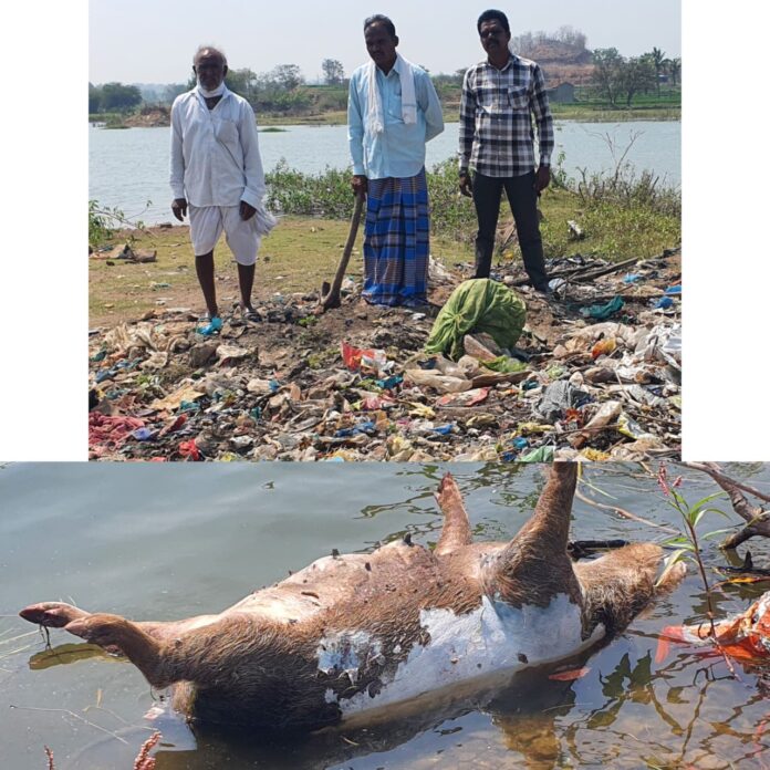 నేటి సాక్షి, కొడిమ్యాల : శుక్రవారం జగిత్యాల జిల్లా కొడిమ్యాల మండలం లోని కొండాపురం మైసమ్మ చెరువులో ఏటా కొన్ని లక్షల పెట్టుబడితో నూట ఇరవై ఆరు కుటుంబాల మత్స్యకారులం చేపల పెంపకం చేస్తు వాటిని పట్టి అమ్ముకొని జీవనోపాధి చేసుకుంటూ జీవిస్తుంటాం. అలాంటి చెరువులో గ్రామంలోని చనిపోయిన పందులని. వేయడంతో అవి నీటిలో పూర్తిగా కుళ్లిపోయి వాసన రావడం. డంపు యార్డులో వేసే చెత్తాచెదారం అంతా చెరువులో వేయడంతో నీళ్లు కలుషితమై చెపలు ఆ చెత్తంతా తిని వేల చెపలు చనిపోవడమే కాకుండా ఆ చెరువులోని చేపలను తినే మనుషులకు కూడా అనారోగ్యం వచ్చే అవకాశం ఉందని. చెపల పెంపకాన్ని నమ్ముకుని బ్రతుకుతున్న మాకు అన్యాయం జరుగుతుంది. మమ్మల్ని పట్టించుకోండి అని మత్స్యకారుల సంఘ అధ్యక్షులు రాగం శంకర్, ఉపాధ్యాక్షులు తోడేటి భూమేష్, కార్యదర్శి కనకట్ల నరేష్, లు తగు అధికారులకు నాయకులకు వాళ్ల బాధని వెళ్లబోసుకుంటూ ఆవేదన వ్యక్తం చేశారు