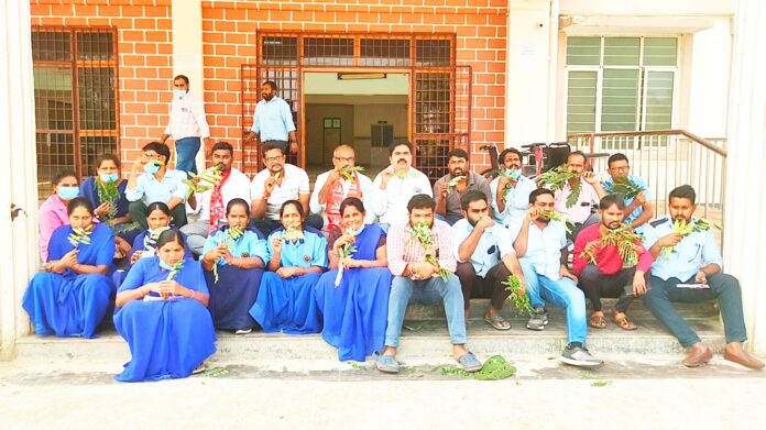 ఆసుపత్రి వద్ద ఆకులు తింటూ కార్మికుల నిరసన