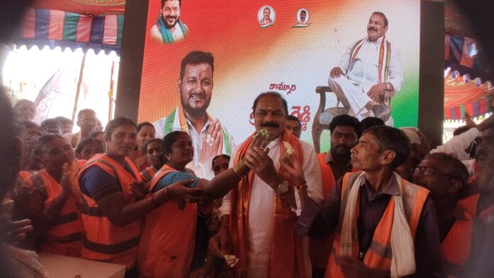 నేటి సాక్షి చేర్యాల : చేర్యాల పట్టణంలో అంగడి బజార్ అంబేద్కర్ చౌరస్తాలో జరిగిన జనగామ డిసిసి అధ్యక్షులు & జనగామ నియోజకవర్గ ఇన్చార్జ్ కొమ్మూరి ప్రతాప్ రెడ్డి పుట్టినరోజు వేడుకలు భారీ ఎత్తున జరిగాయి కేక్ కట్ చేసి జన్మదిన వేడుకలను చేసుకోవడం జరిగింది. మరియు దుస్తులు పంపిణీ చేయడం. తర్వాత అన్నదానం కార్యక్రమం జరిగింది అభిమానులు భారీ సంఖ్యలో హాజరై శుభాకాంక్షలు తెలియజేశారు.ఈ కార్యక్రమానికి చేర్యాల మండల అధ్యక్షులు కొమ్ము రవి పట్టణ అధ్యక్షులు దాసరి శ్రీకాంత్ బ్లాక్ కాంగ్రెస్ అధ్యక్షులు మంజ మల్లేశం జిల్లా ప్రధాన కార్యదర్శి పూర్మా ఆగంరెడ్డి యూత్ కాంగ్రెస్ మహిళా కాంగ్రెస్ సోషల్ మీడియా వివిధ గ్రామ శాఖ అధ్యక్షులు పాల్గొని విజయవంతం చేశారు. చేర్యాల మార్కెట్ కమిటీ చైర్మన్ నల్లనాగుల శ్వేత ఆధ్వర్యంలో మున్సిపాలిటీ సిబ్బందికి దుస్తులు పంపిణీ చేయడం జరిగింది.ఈ కార్యక్రమంలో పాల్గొన్న నాయకులు, కార్యకర్తలు, అభిమానులను ఉద్దేశించి డిసిసి అధ్యక్షులు కొమ్మూరి ప్రతాపరెడ్డి మాట్లాడుతూ తన పుట్టినరోజు సందర్భంగా వేలాది సంఖ్యలో వచ్చిన అభిమానులకు శుభాకాంక్షలు తెలిపి అందరికీ పేరుపేరునా కృతజ్ఞతలు తెలియజేశారు.
