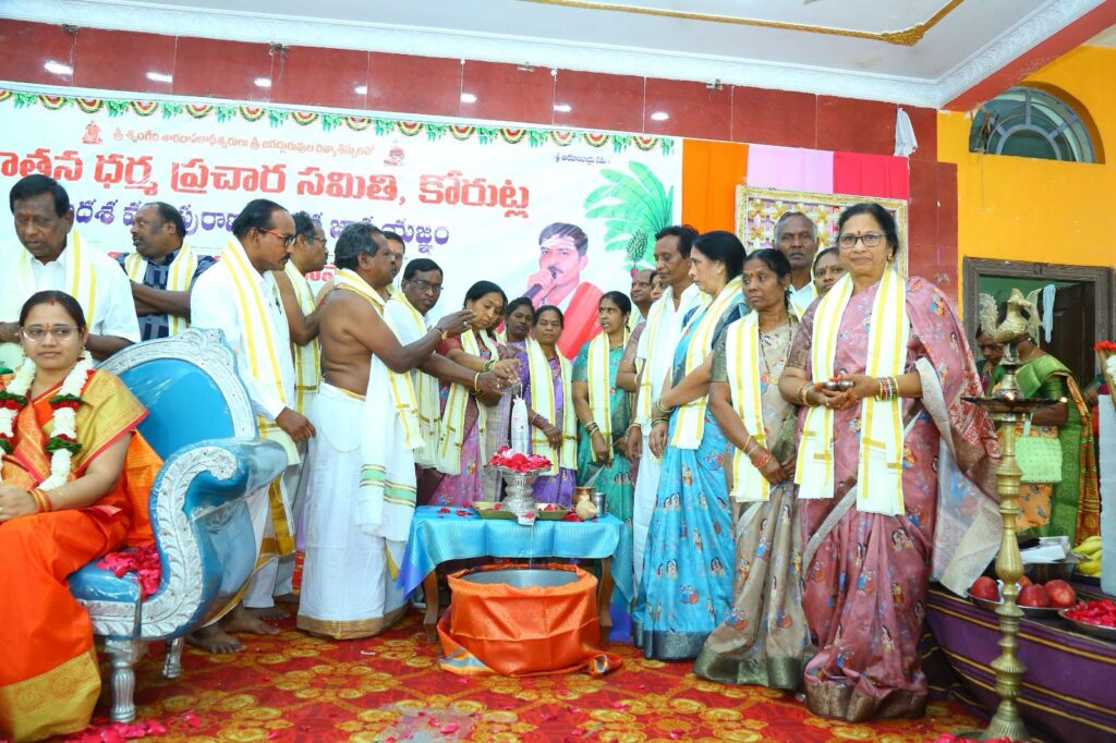 నేటి సాక్షి, కోరుట్ల అర్బన్ (వీఆర్ ధర్మేంద్ర):- నేను, నాది, నా వల్లే అనే అహం భావన విడిచిపెట్టి మనస్ఫూర్తిగా రుద్ర ధ్యానం చేస్తే అంతా శివోహమేనని శృంగేరి శారదా పీఠ ఆస్థాన పౌరాణికులు డాక్టర్ గర్రెపల్లి మహేశ్వరశర్మ పేర్కొన్నారు. సనాతన ధర్మ ప్రచార సమితి ఆధ్వర్యంలో కోరుట్ల వాసవి కళ్యాణ భవనంలో శ్రీలింగ మహాపురాణ సప్తాహం ముగింపు మంగళవారం జరిగింది. ఈ సందర్భంగా సనాతన ధర్మ ప్రచార సమితి అధ్యక్షులు మంచాల జగన్, ప్రధాన కార్యదర్శి బట్టు హరికృష్ణ, పురాణ కమిటీ చైర్మన్ పడిగెల శ్రీనివాస్, కన్వీనర్ మోటూరి రాజుల ఆధ్వర్యంలో గురువందనం కార్యక్రమం వైభవంగా జరిగింది. ఈ సందర్భంగా ప్రవచనం చెప్పిన మహేశ్వర శర్మను నిర్వాహకులు ఘనంగా సన్మానించారు. ముగింపులో భాగంగా మహేశ్వరశర్మ మాట్లాడుతూ దక్ష ప్రజాపతి యజ్ఞం తలపెట్టి శివున్ని అవమానించాలని చెడు ఆలోచనతో నష్టపోయిన కథను వివరించారు. ఎవరైతే ఆ పరమేశ్వరునికి వ్యతిరేకంగా ఆలోచిస్తారో, వ్యవహరిస్తారో వారికి ఓటమి తత్యమన్నారు. రుద్రుని నమ్ముకున్న వారికి అంత శుభమే జరుగుతుందని, అందుకే ఐశ్వర్యాన్ని, శుభాన్నిచ్చే ఈశ్వరున్ని శంకరుడని పిలుస్తున్నామని వివరించారు. కోరుట్ల సనాతన ధర్మ ప్రచార సమితి తలపెట్టిన అష్టాదశ మహాపురాణ ప్రవచన జ్ఞాన యజ్ఞంలో భాగంగా జూలై 4వ తేదీ నుండి 10వ తేదీ వరకు 3వ పురాణ ప్రవచన సప్తాహంగా ‘శ్రీనారద మహాపురాణం’ చెప్పబడుతుందని మహేశ్వరశర్మ పేర్కొన్నారు. ఈ సందర్భంగా కోరుట్ల బ్రాహ్మణ సంఘ ఆధ్వర్యంలో అధ్యక్షులు పాలెపు రామకృష్ణశర్మ నేతృత్వంలో నిర్వహించిన రుద్రాభిషేకంలో భక్తులు పెద్ద సంఖ్యలో పాల్గొని శివ లింగానికి క్షీరాభిషేకం చేశారు. ఈ సందర్భంగా ఏర్పాటుచేసిన మహా అన్న ప్రసాద వితరణలో భాగంగా సుమారు 12వందల మంది భక్తులు అన్న ప్రసాదం స్వీకరించారు. ఈ కార్యక్రమంలో నిర్వాహకులు నీలి కాశీనాథ్, డాక్టర్ గండ్ర దిలీప్ రావు, వొటారి చిన్న రాజన్న, శక్కరి వెంకటేశ్వర్, ఒడ్నాల రామారావు, పొద్దుటూరి జలంధర్, వనపర్తి చంద్రం, మేడి కిషన్, రాచమడుగు శ్రీనివాసరావు, లింగ రాజు, నీలి శ్రీనివాస్, కొత్త వాసు, పల్లెర్ల మహేందర్, కటకం సదాశివ్, రాజేశ్వర్, రమేష్, మహేష్ తదితరులు పాల్గొన్నారు.