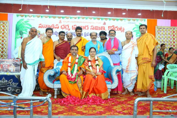 నేటి సాక్షి, కోరుట్ల అర్బన్ (వీఆర్ ధర్మేంద్ర):- నేను, నాది, నా వల్లే అనే అహం భావన విడిచిపెట్టి మనస్ఫూర్తిగా రుద్ర ధ్యానం చేస్తే అంతా శివోహమేనని శృంగేరి శారదా పీఠ ఆస్థాన పౌరాణికులు డాక్టర్ గర్రెపల్లి మహేశ్వరశర్మ పేర్కొన్నారు. సనాతన ధర్మ ప్రచార సమితి ఆధ్వర్యంలో కోరుట్ల వాసవి కళ్యాణ భవనంలో శ్రీలింగ మహాపురాణ సప్తాహం ముగింపు మంగళవారం జరిగింది. ఈ సందర్భంగా సనాతన ధర్మ ప్రచార సమితి అధ్యక్షులు మంచాల జగన్, ప్రధాన కార్యదర్శి బట్టు హరికృష్ణ, పురాణ కమిటీ చైర్మన్ పడిగెల శ్రీనివాస్, కన్వీనర్ మోటూరి రాజుల ఆధ్వర్యంలో గురువందనం కార్యక్రమం వైభవంగా జరిగింది. ఈ సందర్భంగా ప్రవచనం చెప్పిన మహేశ్వర శర్మను నిర్వాహకులు ఘనంగా సన్మానించారు. ముగింపులో భాగంగా మహేశ్వరశర్మ మాట్లాడుతూ దక్ష ప్రజాపతి యజ్ఞం తలపెట్టి శివున్ని అవమానించాలని చెడు ఆలోచనతో నష్టపోయిన కథను వివరించారు. ఎవరైతే ఆ పరమేశ్వరునికి వ్యతిరేకంగా ఆలోచిస్తారో, వ్యవహరిస్తారో వారికి ఓటమి తత్యమన్నారు. రుద్రుని నమ్ముకున్న వారికి అంత శుభమే జరుగుతుందని, అందుకే ఐశ్వర్యాన్ని, శుభాన్నిచ్చే ఈశ్వరున్ని శంకరుడని పిలుస్తున్నామని వివరించారు. కోరుట్ల సనాతన ధర్మ ప్రచార సమితి తలపెట్టిన అష్టాదశ మహాపురాణ ప్రవచన జ్ఞాన యజ్ఞంలో భాగంగా జూలై 4వ తేదీ నుండి 10వ తేదీ వరకు 3వ పురాణ ప్రవచన సప్తాహంగా ‘శ్రీనారద మహాపురాణం’ చెప్పబడుతుందని మహేశ్వరశర్మ పేర్కొన్నారు. ఈ సందర్భంగా కోరుట్ల బ్రాహ్మణ సంఘ ఆధ్వర్యంలో అధ్యక్షులు పాలెపు రామకృష్ణశర్మ నేతృత్వంలో నిర్వహించిన రుద్రాభిషేకంలో భక్తులు పెద్ద సంఖ్యలో పాల్గొని శివ లింగానికి క్షీరాభిషేకం చేశారు. ఈ సందర్భంగా ఏర్పాటుచేసిన మహా అన్న ప్రసాద వితరణలో భాగంగా సుమారు 12వందల మంది భక్తులు అన్న ప్రసాదం స్వీకరించారు. ఈ కార్యక్రమంలో నిర్వాహకులు నీలి కాశీనాథ్, డాక్టర్ గండ్ర దిలీప్ రావు, వొటారి చిన్న రాజన్న, శక్కరి వెంకటేశ్వర్, ఒడ్నాల రామారావు, పొద్దుటూరి జలంధర్, వనపర్తి చంద్రం, మేడి కిషన్, రాచమడుగు శ్రీనివాసరావు, లింగ రాజు, నీలి శ్రీనివాస్, కొత్త వాసు, పల్లెర్ల మహేందర్, కటకం సదాశివ్, రాజేశ్వర్, రమేష్, మహేష్ తదితరులు పాల్గొన్నారు.