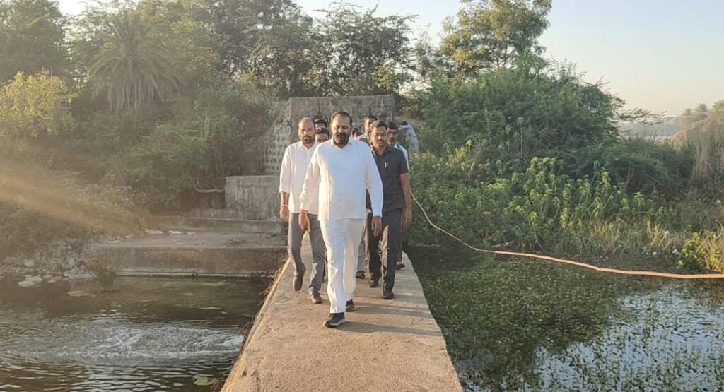 కాకతీయ కాలువ నుండి పెద్దాపూర్ చెరువును నింపడం ద్వారా హుస్సేన్ మియా వాగు పరివాహక ప్రాంత పంట పొలాలకు సాగు నీరు అందించేందుకు చర్యలు తీసుకుంటున్నట్టు పెద్దపల్లి ఎమ్మెల్యే చింతకుంట విజయ రమణారావు తెలిపారు. శనివారం ఉదయం జూలపల్లి మండలం పెద్దాపూర్ గ్రామంలోని చెరువును ఆయన పరిశీలించారు. కాకతీయ కాలువ (సిఆర్) నుండి డి-83 కెనాల్ ద్వారా పెద్దాపూర్ చెరువును నింపుతూ, చెరువు ముత్తడి ద్వారా నీటిని హుసేనిమియా వాగులోకి పంపిణీ చేయబడుతుందని చెప్పారు. హుసేనిమియా వాగు పరివాహక ప్రాంతంలోని రైతులకు మేలు జరుగుతుందని పేర్కొన్నారు. ఈ మేరకు వెంటనే తగిన చర్యలు తీసుకోవాలని ఇరిగేషన్ శాఖ ఎస్ ఈ, ఈఈ తదితర అధికారులను ఎమ్మెల్యే ఫోన్ ద్వారా ఆదేశించారు. ఈ కార్యక్రమంలో కాంగ్రెస్ పార్టీ నాయకులు దూలికట్ట పిఏఎస్సి చైర్మన్ పుల్లూరి వేణుగోపాల్ రావు, జూలపల్లి మండలం వ్యవసాయ మార్కెట్ కమిటీ చైర్మన్ గండు సంజీవ్, కాంగ్రెస్ పార్టీ మండల అధ్యక్షులు బొజ్జ శ్రీనివాస్, వ్యవసాయ మార్కెట్ వైస్ చైర్మన్ కొమ్ము పోచలు, సిరికొండ కొమురయ్య, బండి స్వామి, జక్కని శంకరయ్య,పెసర స్వామి, చెరుకు కనకయ్య,తదితరులు పాల్గొన్నారు.