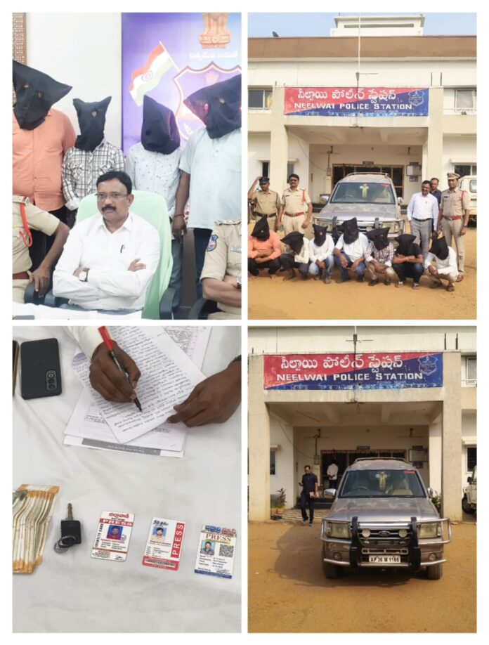 నేటి సాక్షి, వేమనపల్లి : విలేకర్ల ముసుగులో అక్రమ దందాలు కొనసాగిస్తున్న బ్లాక్మెయిలింగ్ పాల్పడుతున్న ఏడుగురు విలేకరులపై నీల్వాయి పోలీస్ స్టేషన్లో కేసు నమోదు చేసి అరెస్టు చేసి రిమాండ్ కు తరలిస్తున్నట్లు జైపూర్ ఎసిపి వెంకటేశ్వర్లు తెలిపారు.నీల్వాయి పోలీస్ స్టేషన్లో విలేకరుల సమావేశం ఏర్పాటు చేసి నిందితుల వివరాలు వెల్లడించారు.బాధితుడూ జక్కుల శ్రీధర్,మొగలి అనిల్ సుంపుటం గ్రామంలో ఆరు ఎడ్లను కొనుగోలు చేసి పెద్దపల్లి పశువుల సంతకు తరలిస్తున్న సమయంలో ఈ దొంగ విలేకరుల అరాచకం బయటపడింది. ఏడుగురు విలేకర్లు రిమాండ్ వివిధ పత్రికలో పని చేస్తున్న చొప్పదండి జనార్ధన్, మాసాని రమేష్, తగరం వెంకటేష్, తోడేటి సంతోష్, జిల్లపల్లి పోచం, దొబ్బల విష్ణు, తుంగ రమేష్ లుగా గుర్తించి అరెస్టు చేసి రిమాండ్ కు తరలించారు. వీరు ఏడుగురు గ్రూపుగా ఏర్పడి ఒక సంవత్సరం నుండి చుట్టుపక్క మండలాలతో పాటు గ్రామాలలో తిరుగుతూ వాహనాలను ఆపి నకిలీ విలేకరుల అవతారమెత్తి వచ్చే వాహనాలను బట్టి డబ్బులు వసూలు చేశారు.వీరు గతంలో కూడా చాలా వాహనాలన వద్ద అమాయక ప్రజలను బెదిరించి పెద్ద మొత్తంలో డబ్బులు వసూలు చేశారని జక్కుల శ్రీధర్ అనే వ్యక్తి ఇచ్చిన ఫిర్యాదుతో కేసు నమోదు చేసి దర్యాప్తు చేయగా వీరి నుండి రూ. 50 వేలు ఫోన్ పే ద్వారా ట్రాన్స్ఫర్ చేసుకుని అవి చాలాది అన్నట్టు ఇంకో రూ. 30వేలు కావాలని డిమాండ్ చేయడంతో బాగోతం బయటపడింది. ఇలాంటివే సంఘటనలు ఇంకా జరిగాయి.గాదే మహేష్ వ్యక్తి ని బెదిరించి రూ. 30వేల రూపాయలు తీసుకున్నారని తెలిపారు. లక్షిట్టిపేటకు చెందిన చల్ల కుమార్ వద్ద నుంచి డబ్బులు ప్రాణహిత తీరంలో జనగామ ఆల్గామ మధ్యలో పంట చేన్లో ఉన్న తేకు దుంగలను ఫారెస్ట్ అధికారులకు పట్టిస్తామని యజమాని దగ్గర రూ. 9 వేలు తీసుకున్నారు. ఒక కారు తీసుకుని దానికి ప్రెస్ అని బోర్డు వేసుకొని హల్చల్ చేశారు.వారి నుండి ఒక కారు, రూ. 90వేలు నగదు, ప్రెస్ డూప్లికేట్ ఐడి కార్డులు స్వాధీనం చేసుకున్నామని తెలిపారు. వారిని బెల్లంపల్లి కోర్టులో హాజుపరిచి వారిని రిమాండ్ కు తరలించడం జరుగుతుందని తెలిపారు.