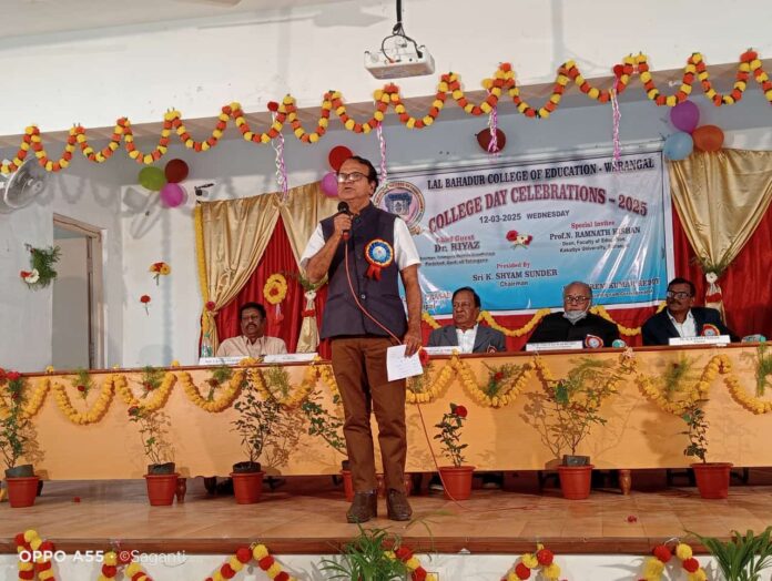 నేటి సాక్షి ఉమ్మడి వరంగల్ జిల్లా స్టాఫ్ రిపోర్టర్ (సందెల రాజు) : వరంగల్ ములుగు రోడ్డు లో లాల్ బహదూర్ విద్యా కళాశాల లో బుధవారం వార్షికోత్సవం అంగరంగ వైభవంగా జరిగింది. ముఖ్య అతిథిగా రాష్ట్ర గ్రంథాలయాల పరిషత్ చైర్మన్ డాక్టర్ రియాజ్ ఈ కార్యక్రమంలో పాల్గొని కాబోయే ఉపాధ్యాయులకు శుభాకాంక్షలు తెలిపి భవిషత్తు లో మంచి ఉపాధ్యాయులుగా పేరు తెచ్చుకోవాలని.. కాలేజీ పేరు నిలబెట్టాలని టీచర్ ఉద్యోగం కోసమే కాకుండా గ్రూప్ పరీక్షల పై కూడా దృష్టి పెట్టాలని ఇదే కాలేజీ లో మొదటి లెక్చరర్ గా నియామకం అయ్యానని ఇప్పుడిదే కాలేజీ లో గెస్ట్ గా వచ్చానని ఎల్ బి కాలేజీ అనేది ఒక బ్రాండ్ అని సంతోషాన్ని వెలిబుచ్చారు. లెక్చరర్లకు, విద్యార్థులకు తగు సూచనలు ఇచ్చి తన గత జ్ఞాపకాలను నెమరు వేసుకున్నారు అనంతరం వివిధ పోటీల్లో విజేతలుగా నిలిచిన వారికి జ్ఞాపికలను అంద జేశారు. అనంతరం సాంస్కృతిక కార్యక్రమాలతో విద్యార్దులు అలరించారు విశిష్ట అతిథిగా కాకతీయ యూనివర్సిటీ విద్యా విభాగం డీన్ ప్రొఫెసర్ రామ్ నాథ్ కిషన్ ఈ కార్యక్రమంలో పాల్గొన్నారు. ఈ కార్యక్రమంలో కాలేజీ చైర్మన్ శ్యాం సుందర్, సెక్రటరీ ప్రేమ్ కుమార్ రెడ్డి, జాయింట్ సెక్రటరీ జస్పాల్ సింగ్, ప్రిన్సిపాల్ లక్ష్మీ ప్రసాద్, లెక్చరర్స్, ఛాత్రోపాద్యాయులు పాల్గొన్నారు.